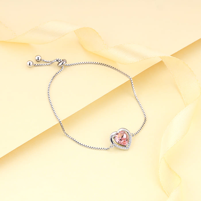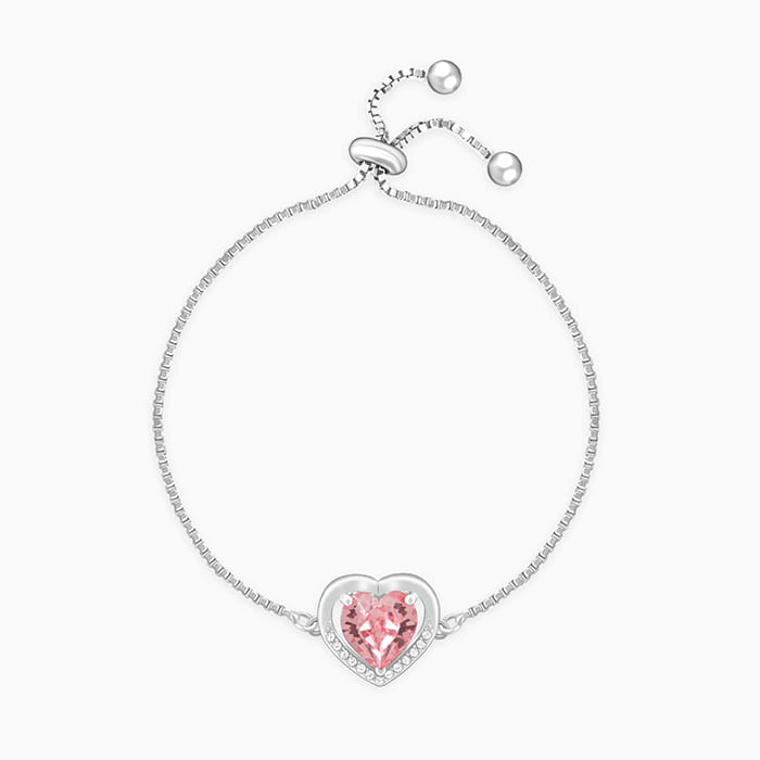 This silver bracelet features a dreamy pink zircon heart, prong set in rhodium-coated silver with an outline frame of CZ's.