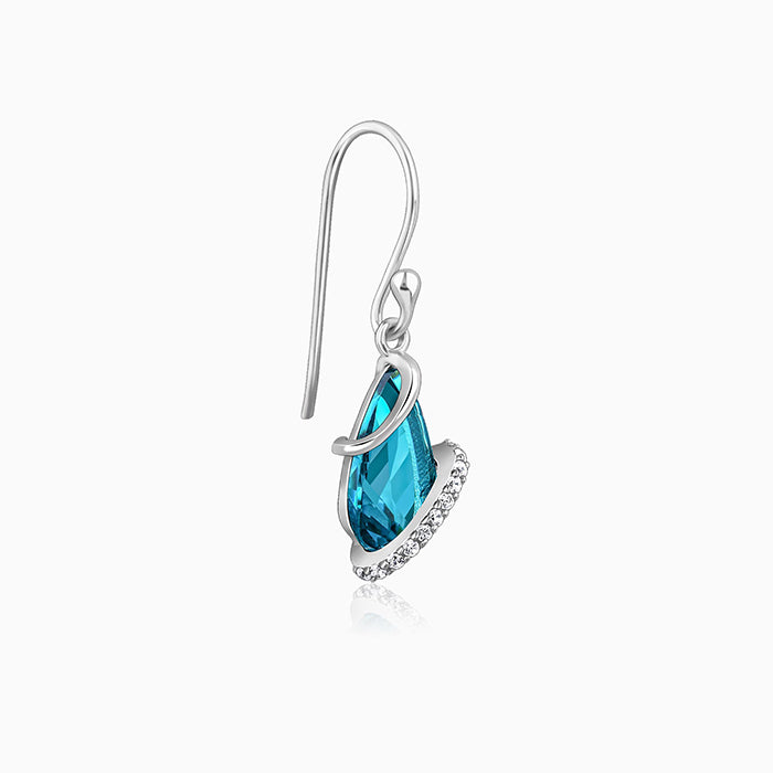 These silver drop earrings feature a blue-coloured stone with a zircon-studded ring around it.