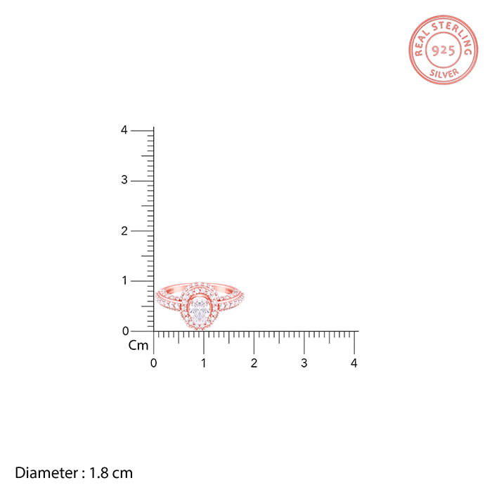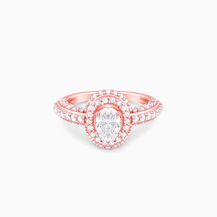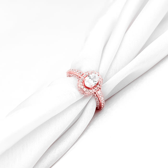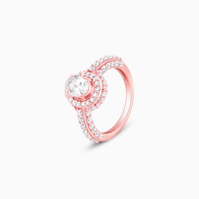 This ring features an oval design motif with a large zircon placed inside and small ones studded around the oval and on the band.