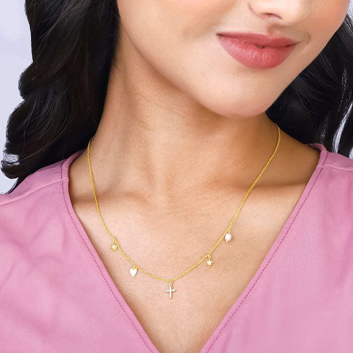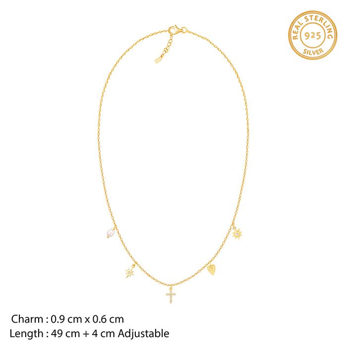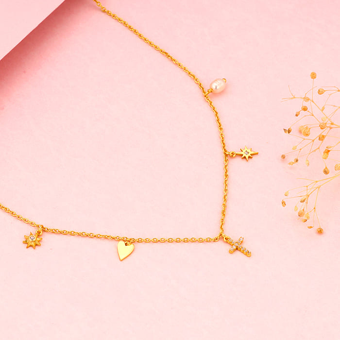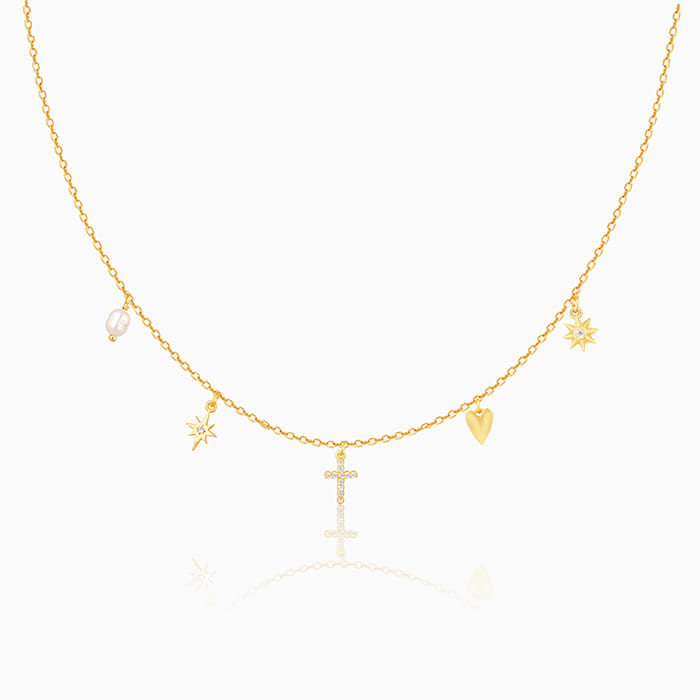 This golden necklace features five charms, which include a pearl, a heart, a cross, a star and a flower dangling from the necklace.