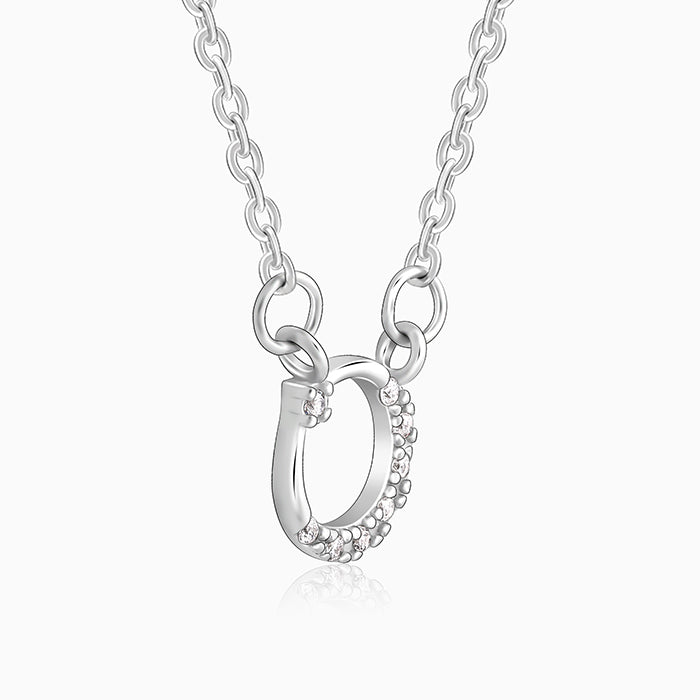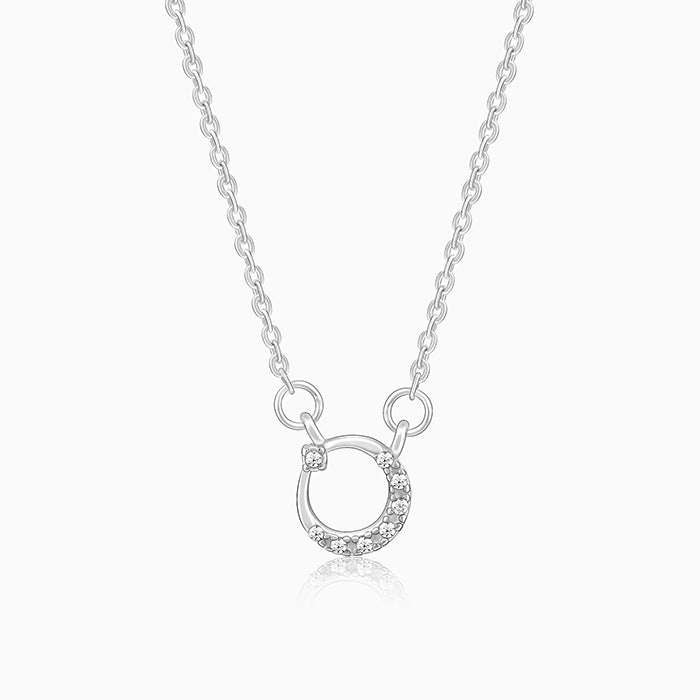 This silver necklace features a moon motif studded with zircons.