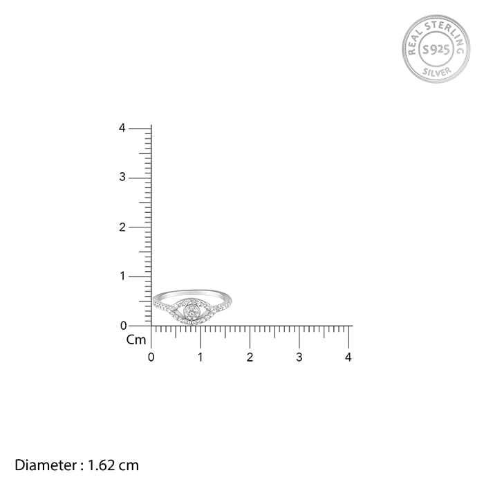 This silver ring features an eye motif studded with zircons.