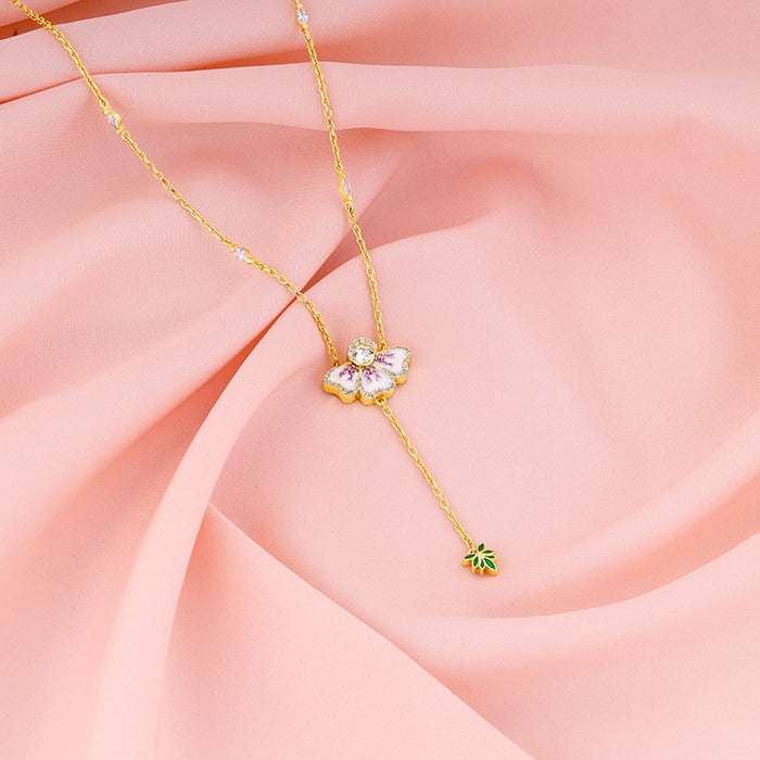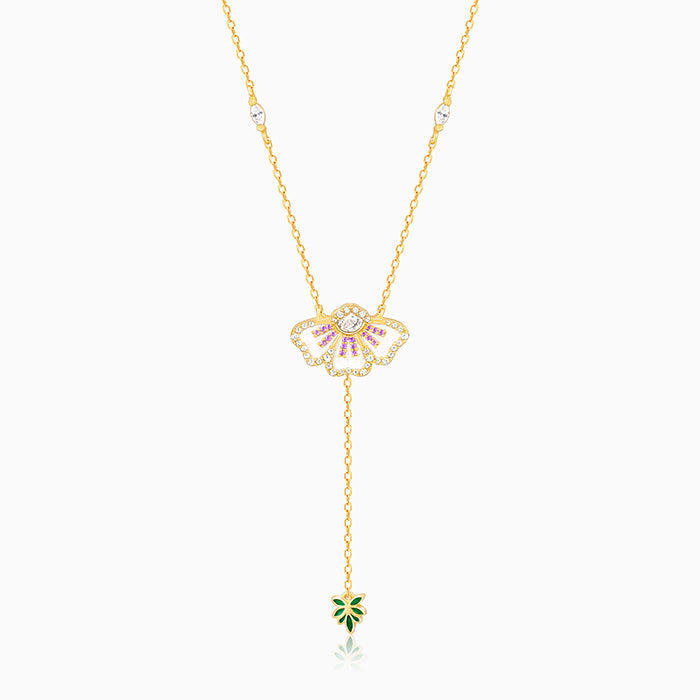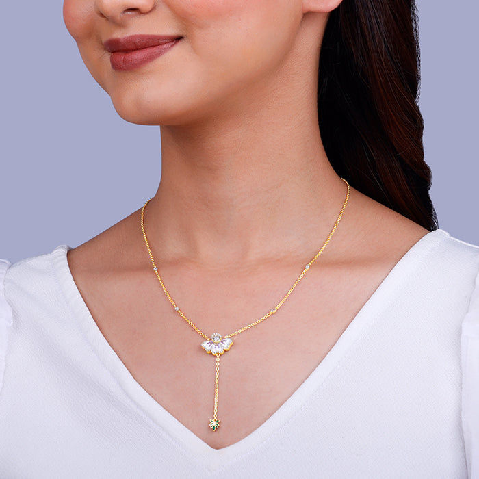 This golden necklace features an eye-bright motif with enamel and zircons, accompanied by a chain holding a leaf below, which is adorned with enamel. Celebrate the beauty of nature's rarest blooms with GIVA and Bhumi Pednekar - The Bhumi Collection.