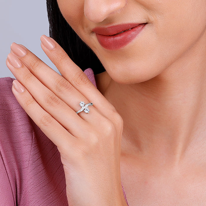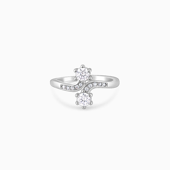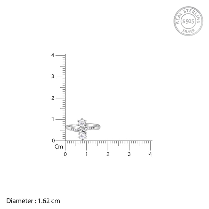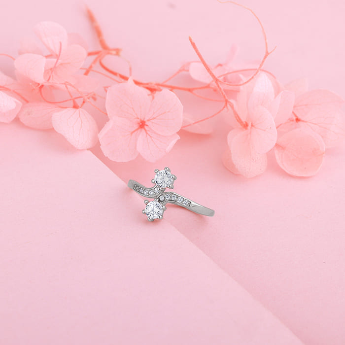 This silver ring features a dual flower motif at the centre with zircon studded in it.