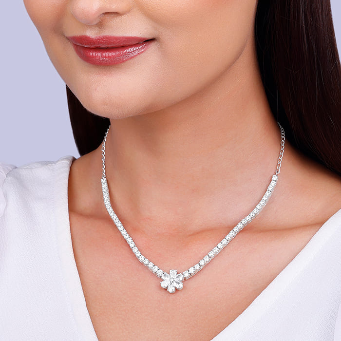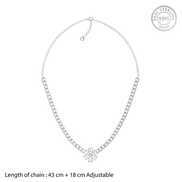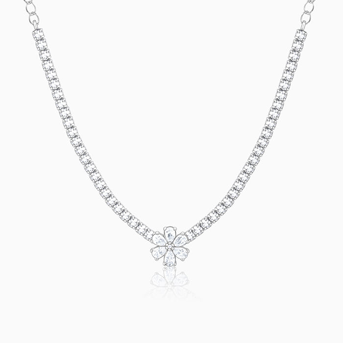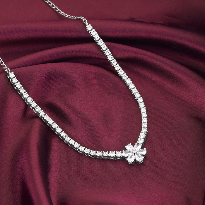 This silver necklace features a flower motif set with zircons in the centre of a zircon studded chain.