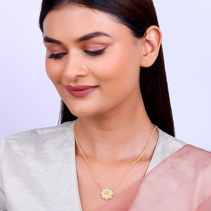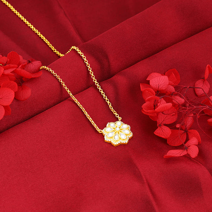 This golden necklace has a flower motif with rose-cut glass stones and a zircon placed in the centre. Presenting GIVA's chic #VivaahDaSwag Collection for an unforgettable wedding.