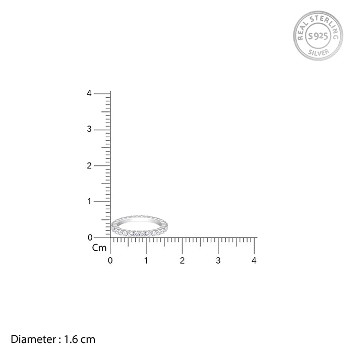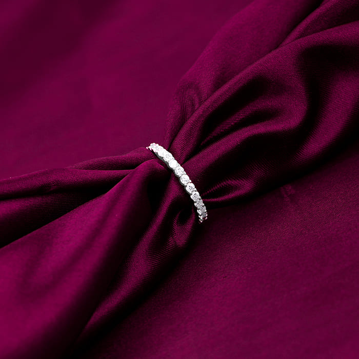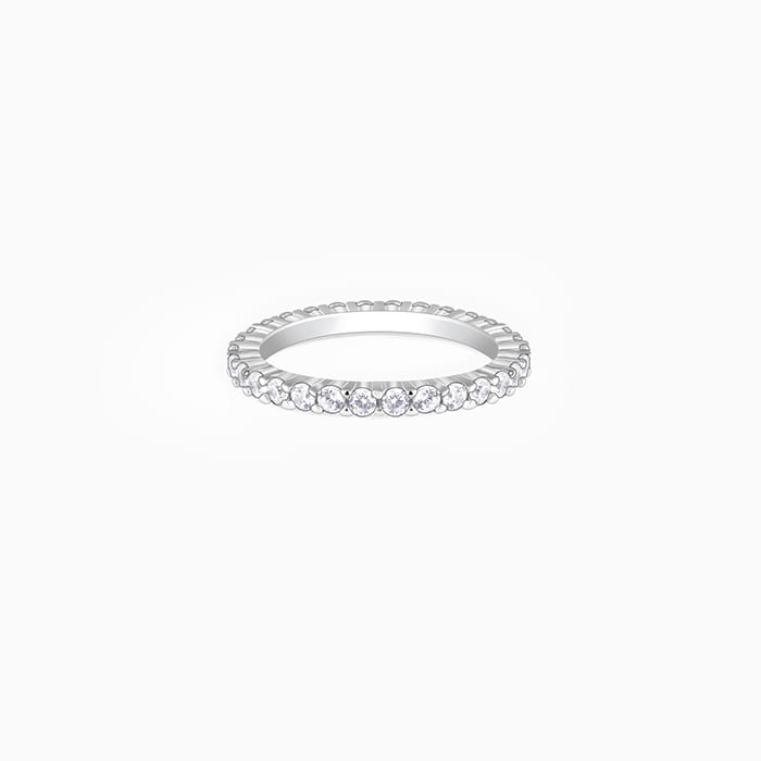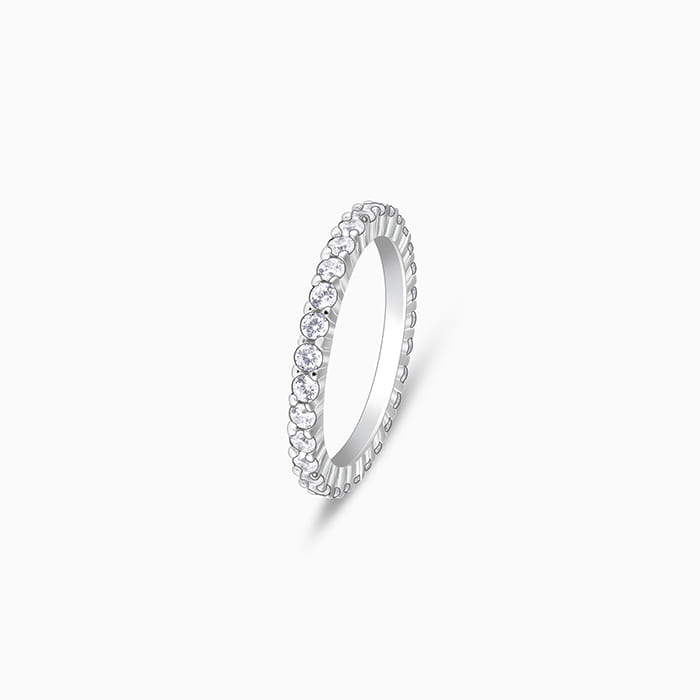 This silver ring features a gorgeous design with zircon studs encircling the band in french pave setting.
