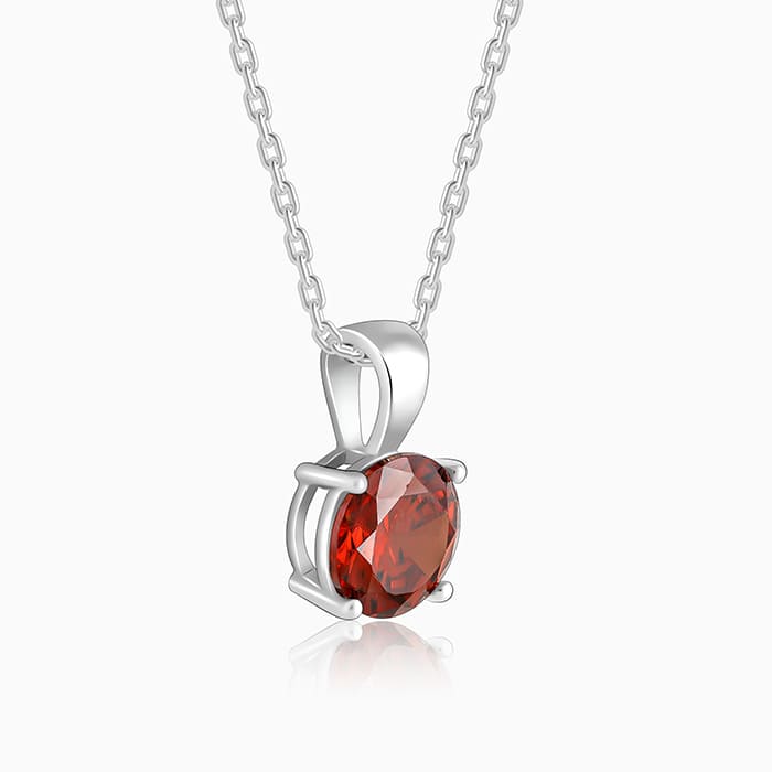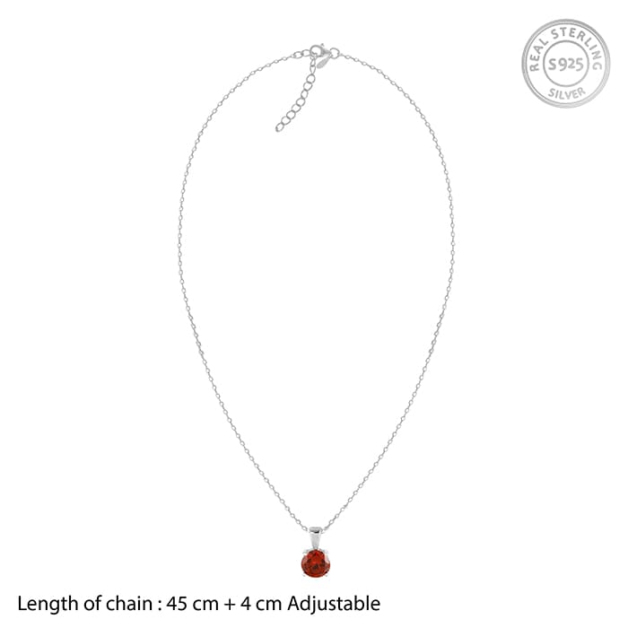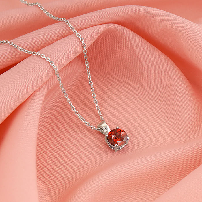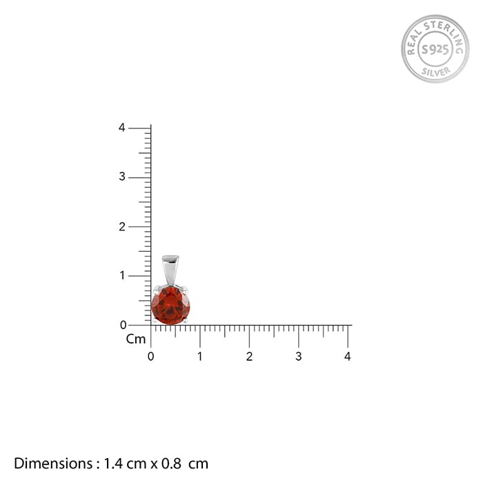 This silver pendant features a circular design with a red-coloured stone in the centre.