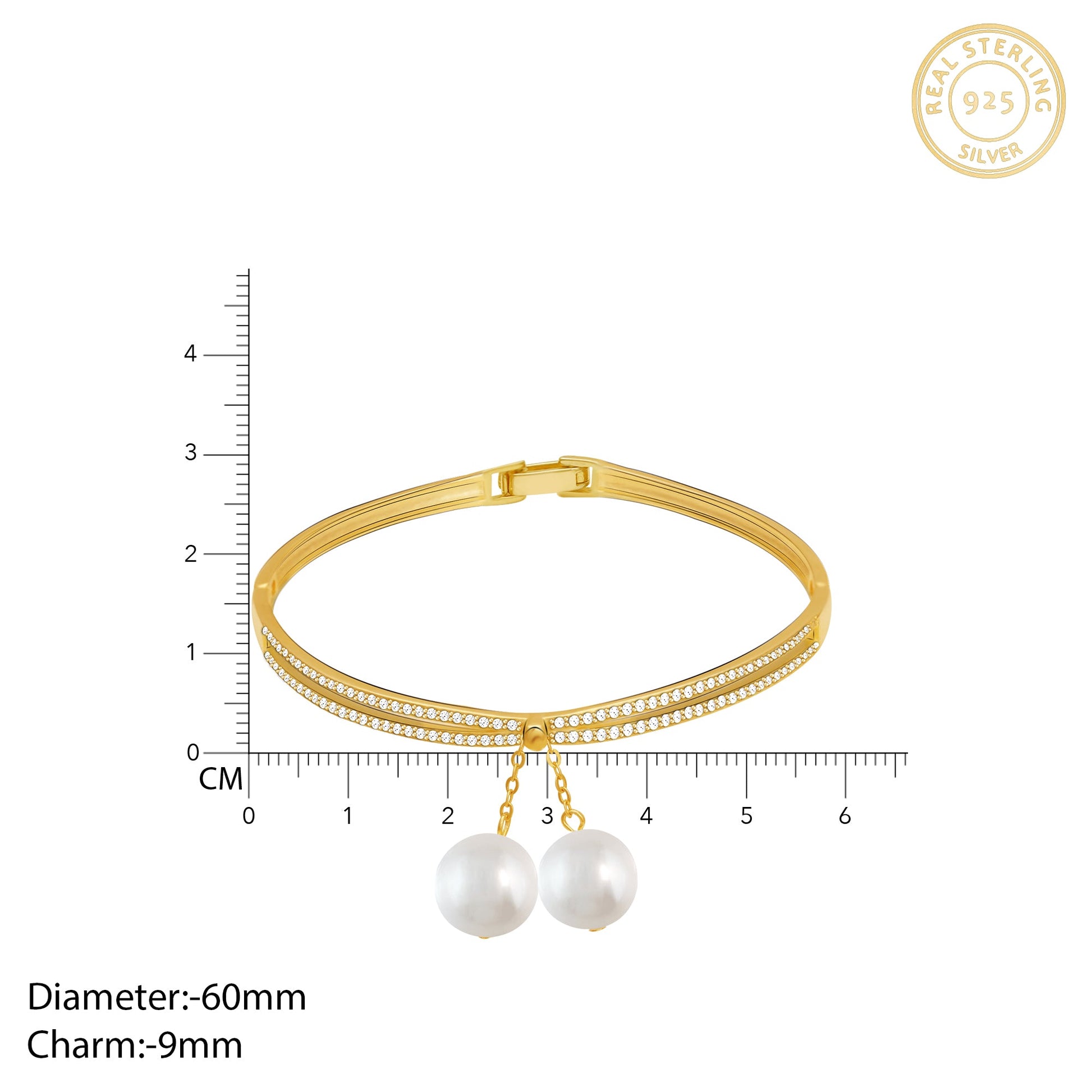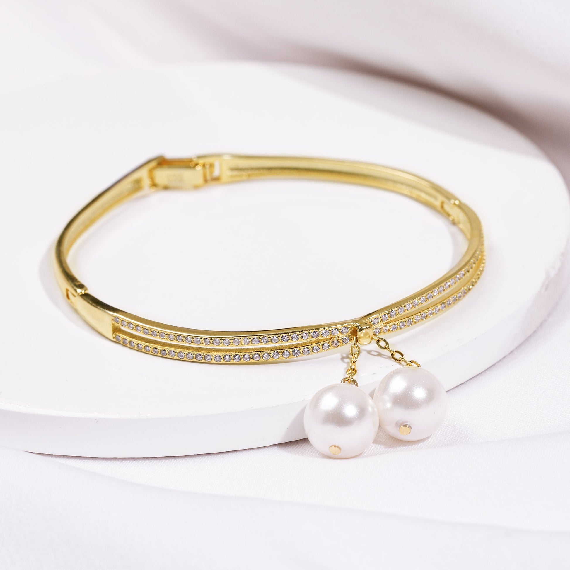 Any look is incomplete without that statement bracelet. That is why we made this Golden Dangling Pearl Bangle Bracelet.