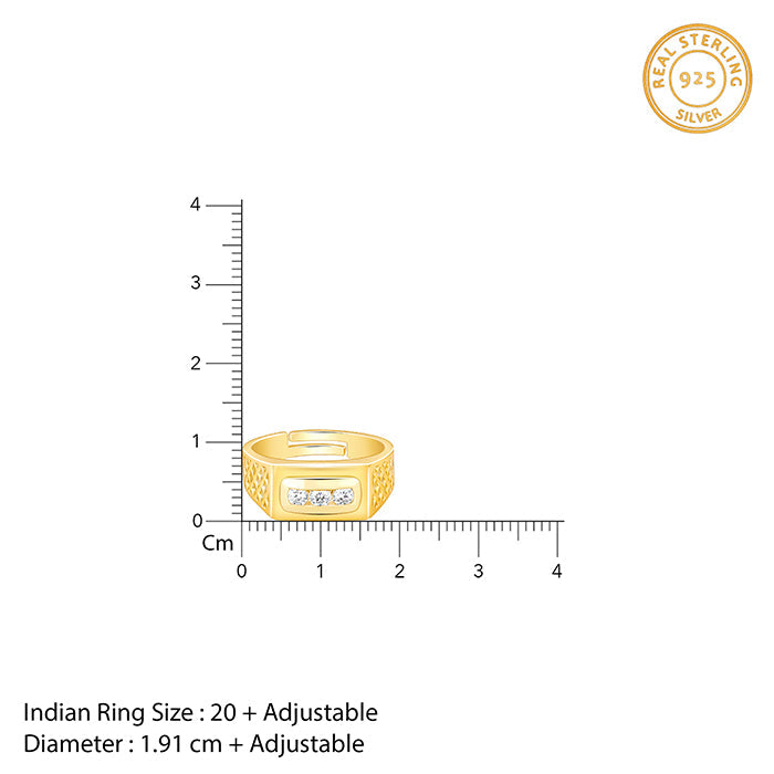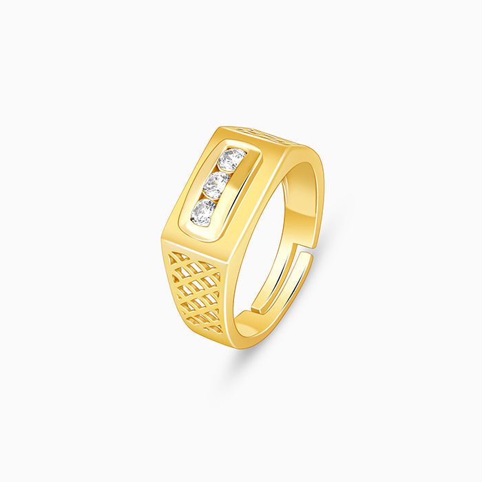This gold plated ring for men features an intricate-patterned rectangular motif of zircons, in the centre and a studded band.