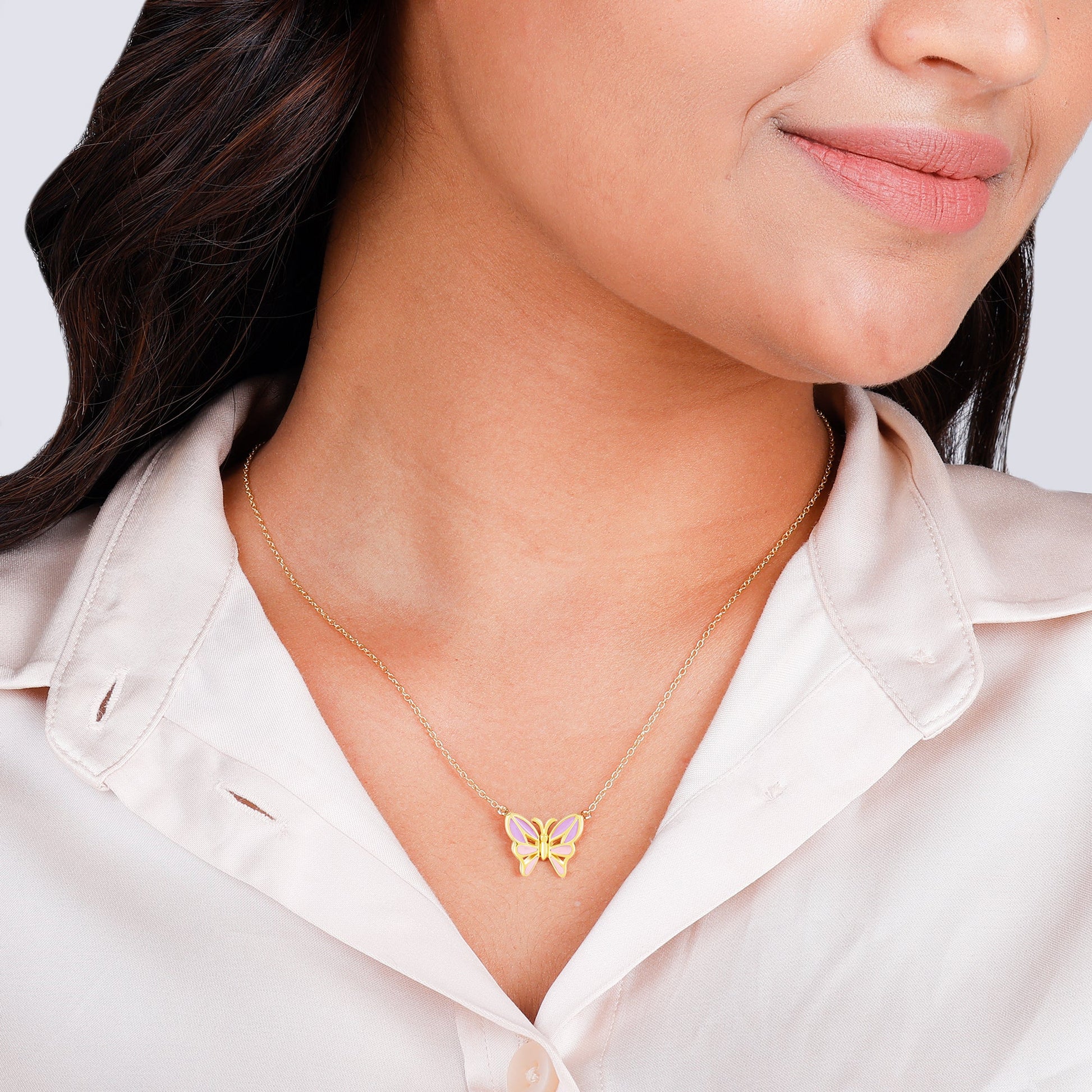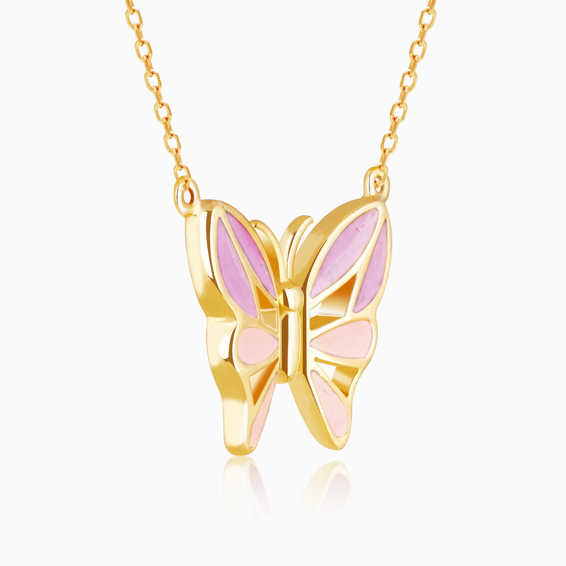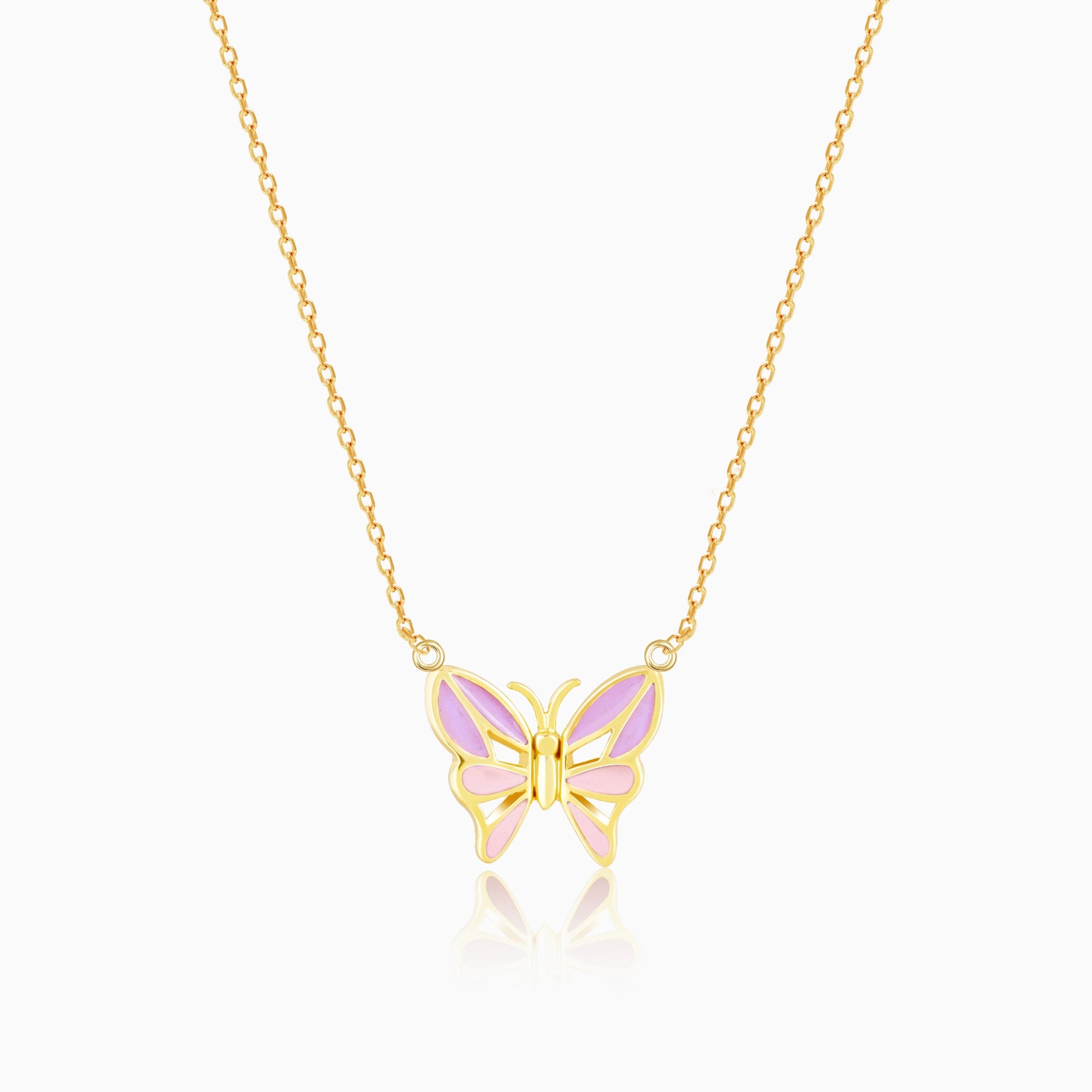 This golden necklace has a butterfly design filled with with purple and pink enamel.
