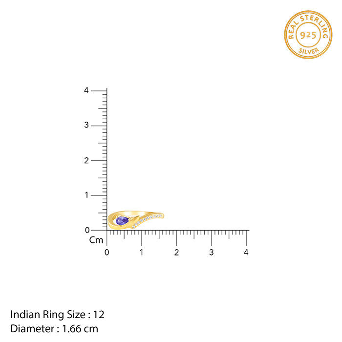 This gold plated ring for women features a pear cut blue coloured zircon as the centrepiece. An asymmetric band with a subtle twist, with one side studded with zircons, adds a touch of elegance.