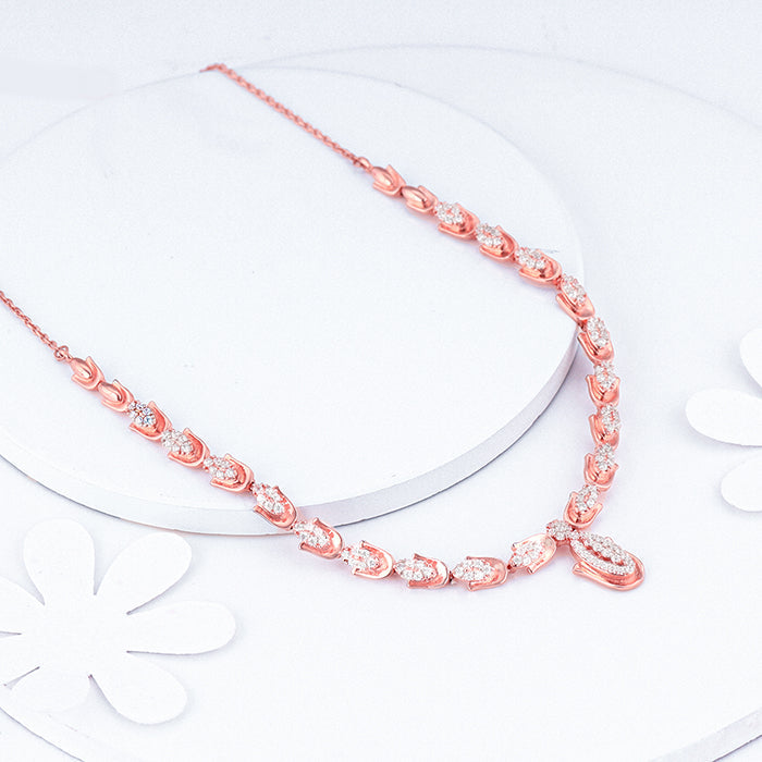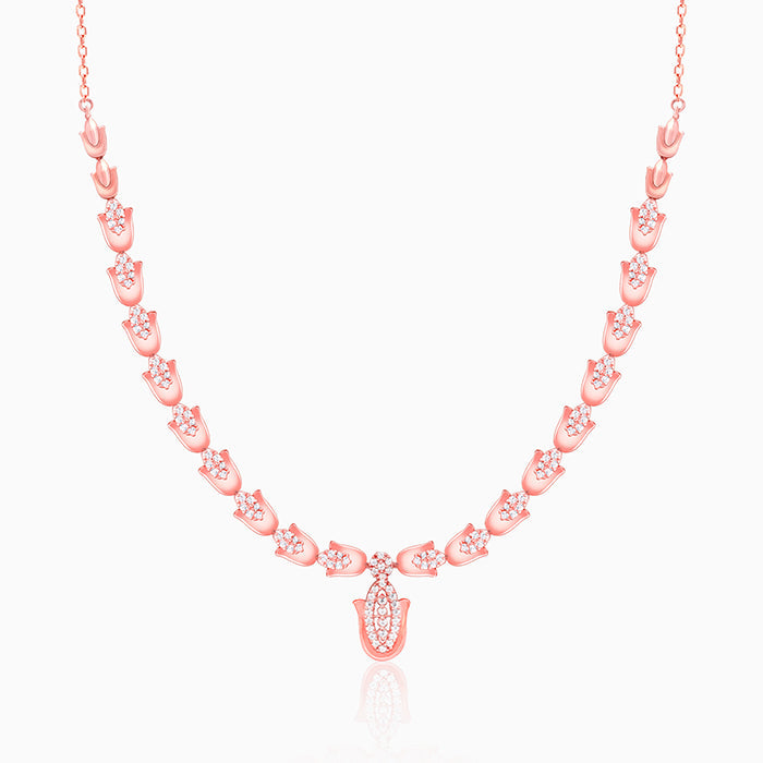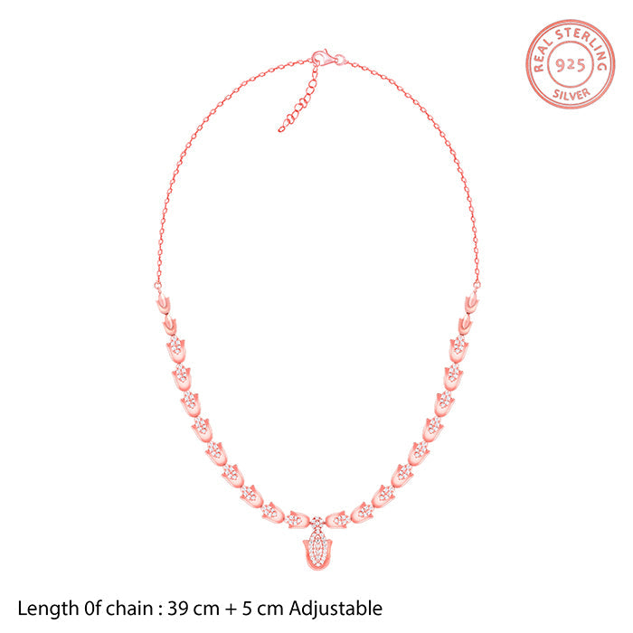 This rose gold necklace has a hamsa motif all over the chain holding zircon-studded teardrop.