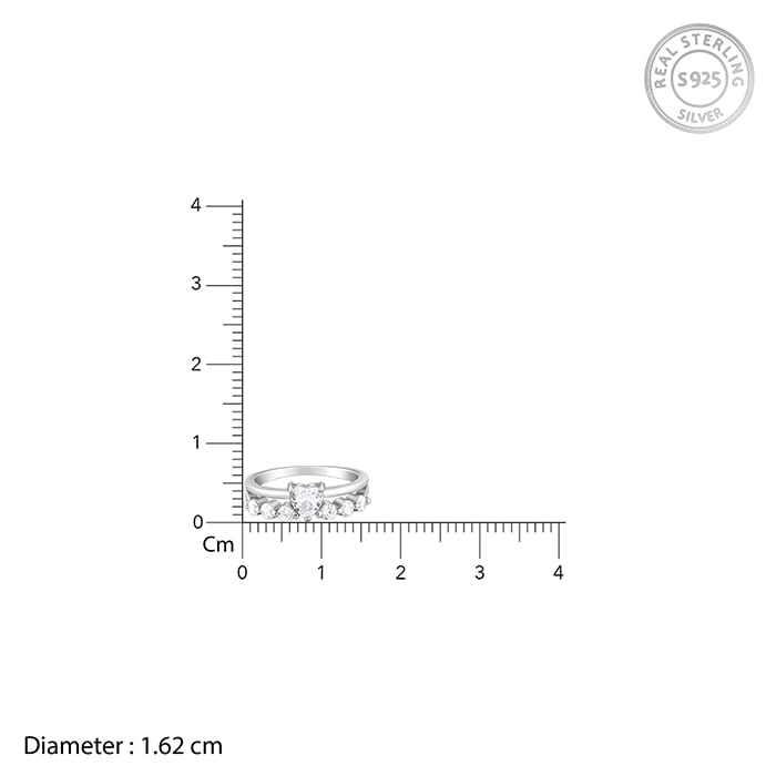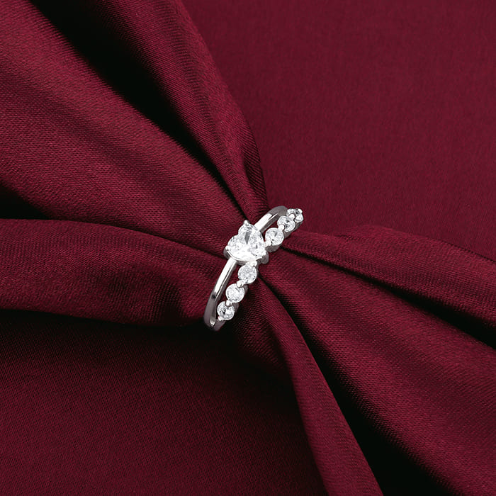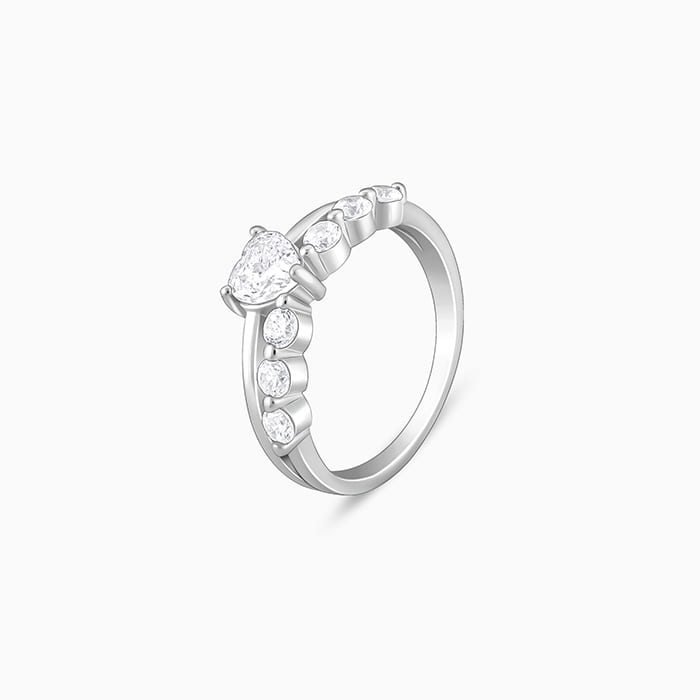 This silver ring features a heart-shaped zircon above a line of smaller circular zircons.