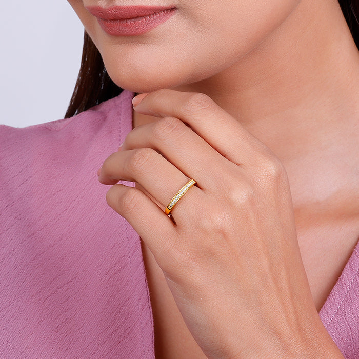 This golden ring has zircons in a channel setting that extends to the front half of the band.