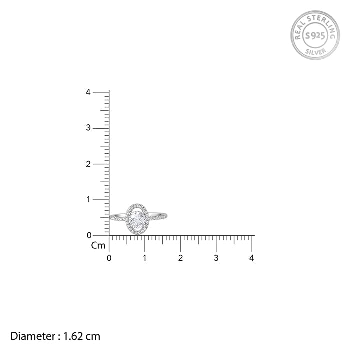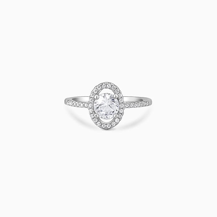 This silver ring features an oval motif with a large zircon placed at the centre, accompanied by additional zircons studded along the centre and the band.