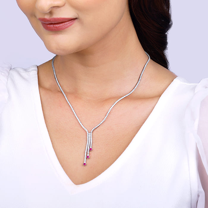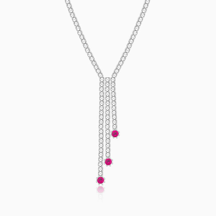 This silver zircon studded necklace has a lariat design that ends with three red coloured stones at the bottom.