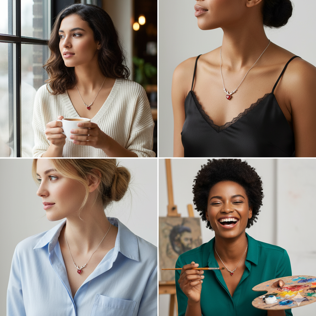 The Silver Deer Heart in Red Necklace is inspired by the beauty and elegance of the deer.