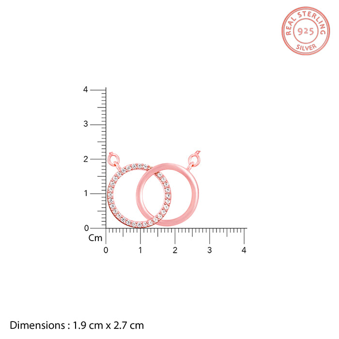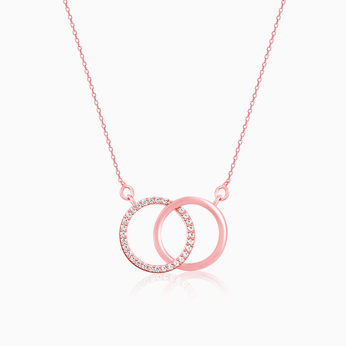 The rose gold necklace has two circles intertwined with one studded with designs.