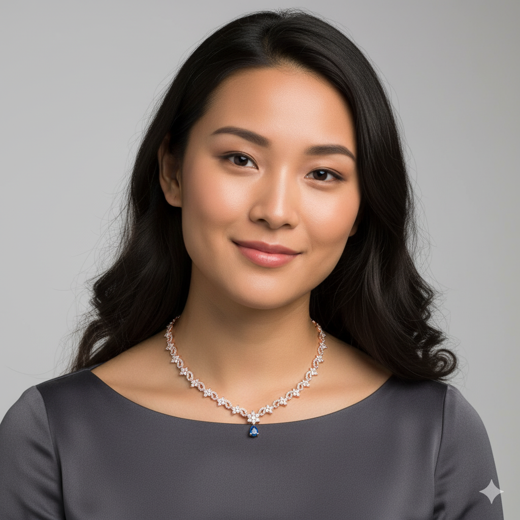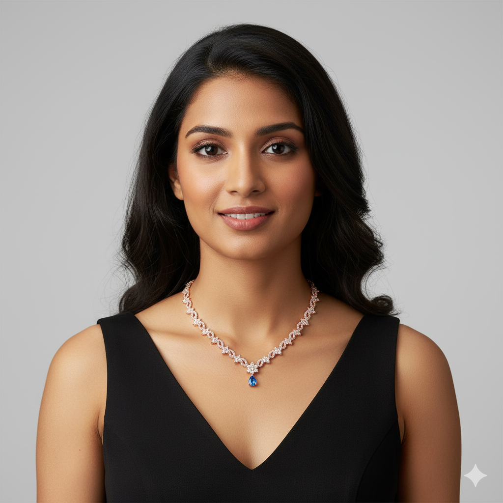 This rose gold necklace has an elegant design with studded zircons, and crystal blue-coloured stone at the centre.