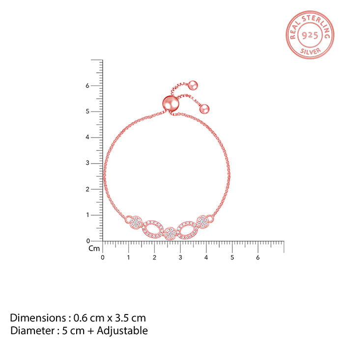 This rose gold bracelet has an infinity symbol with zircons studded between them.