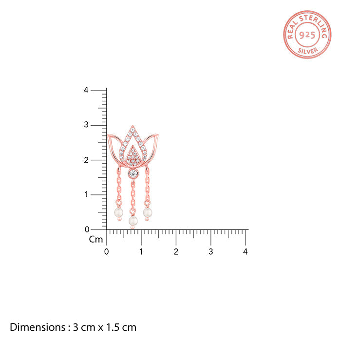 These rose gold earrings feature a lotus motif, with the centre petal studded in zircons and three dangling chains holding pearls. Celebrate the timeless beauty of Indian textiles with GIVA's latest 'Magic of Tradition' collection. Wear and celebrate tradition, anytime.