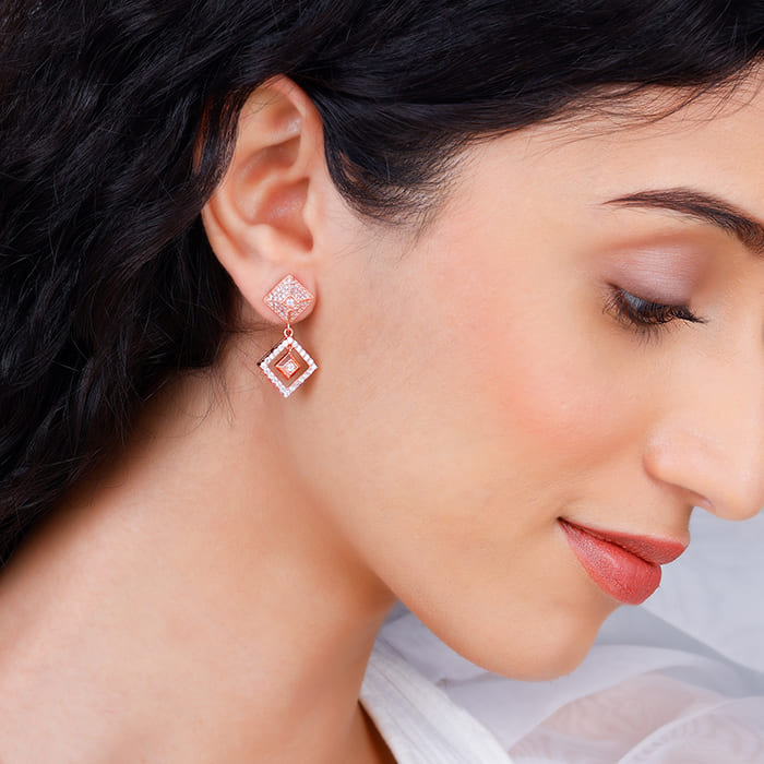These rose gold signature earrings have an intricate design studded with zircons, giving the earrings a gorgeous look. The diamond shape of the jewellery is inspired by the GIVA logo.