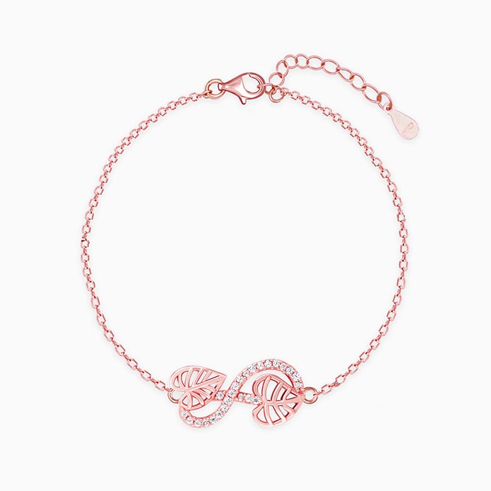 The rose gold bracelet features a leaf design with the veins prominent and an infinite symbol in between studded with zircons