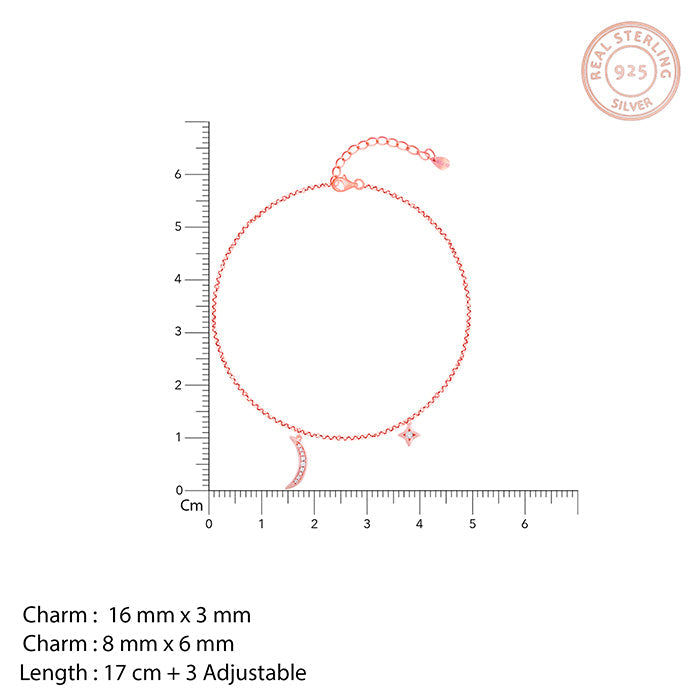 The Rose Gold Bracelet has a diamond-shaped charm and a crescent moon dangling from the bracelet with zircons studded on them.