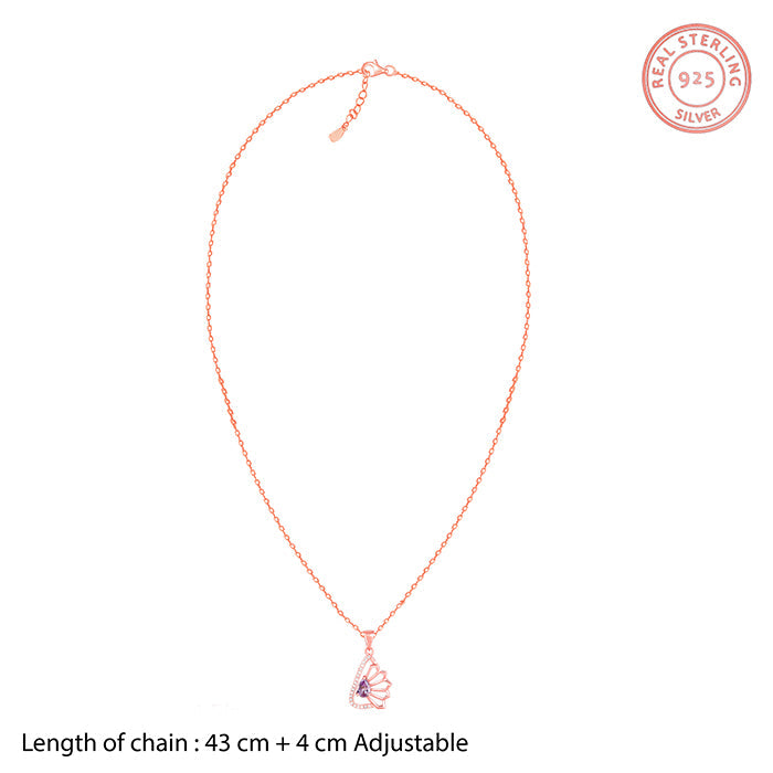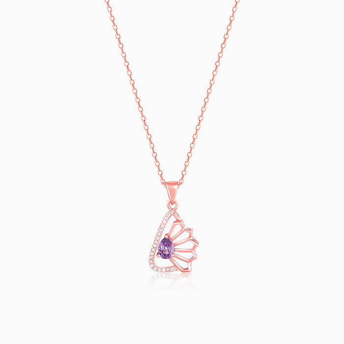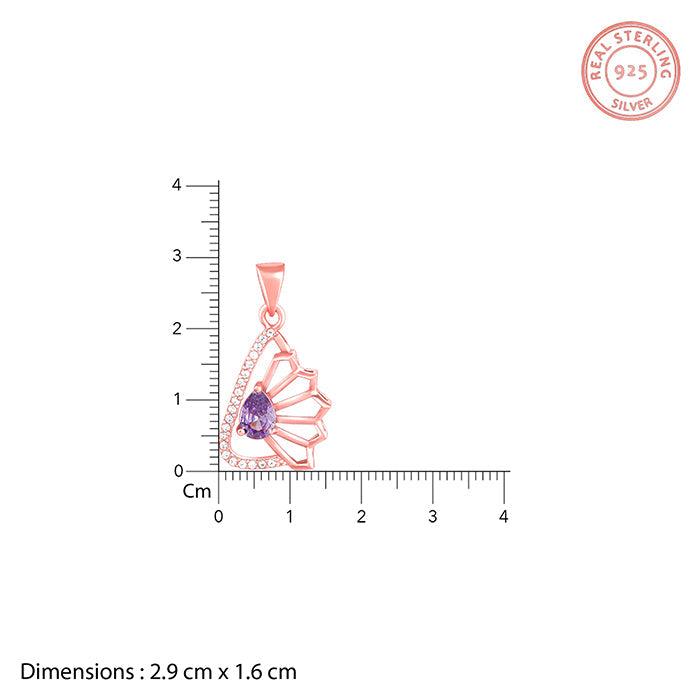 The rose gold pendant carries a peri-coloured stone placed at the centre. Half odd the frame is flower motif, while white zircons studs the other side of the teardrop frame.