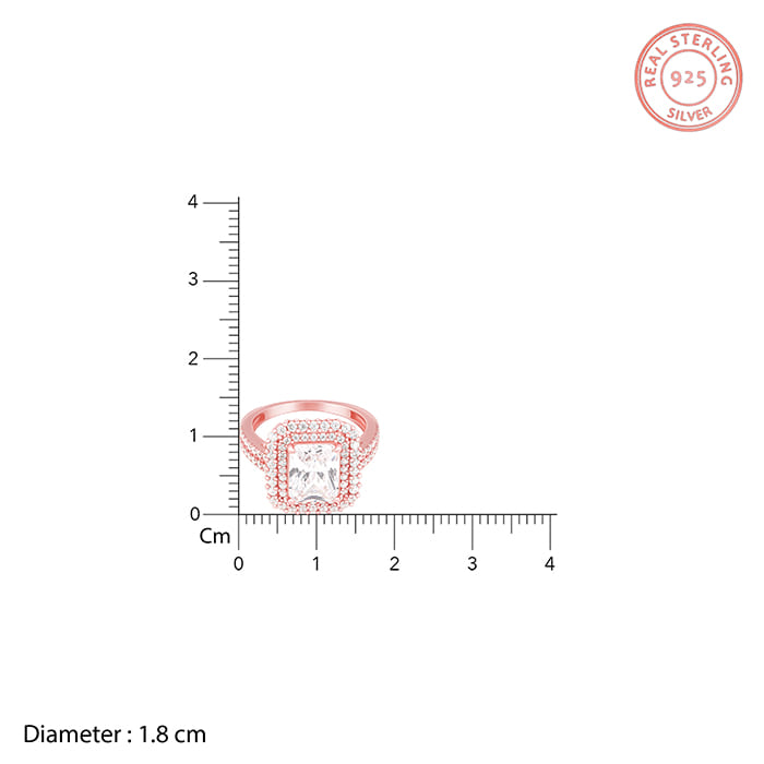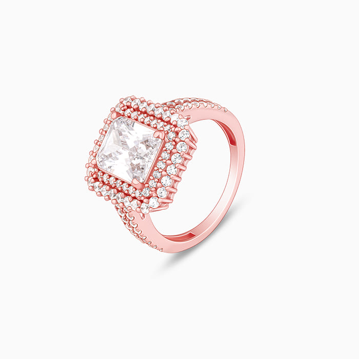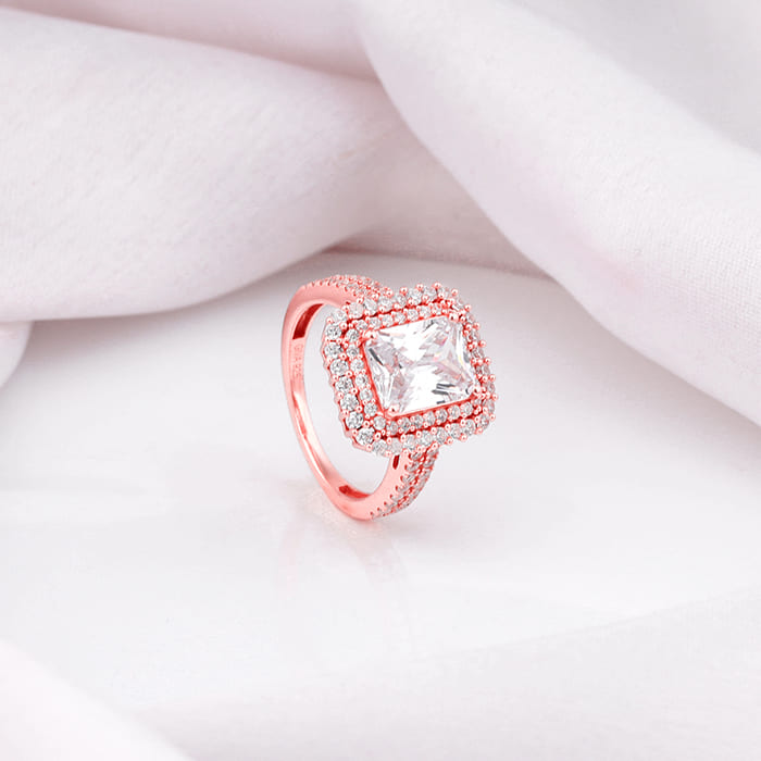 This rose gold ring has a large square-cut zircon at the centre surrounded by smaller in size zircons.
