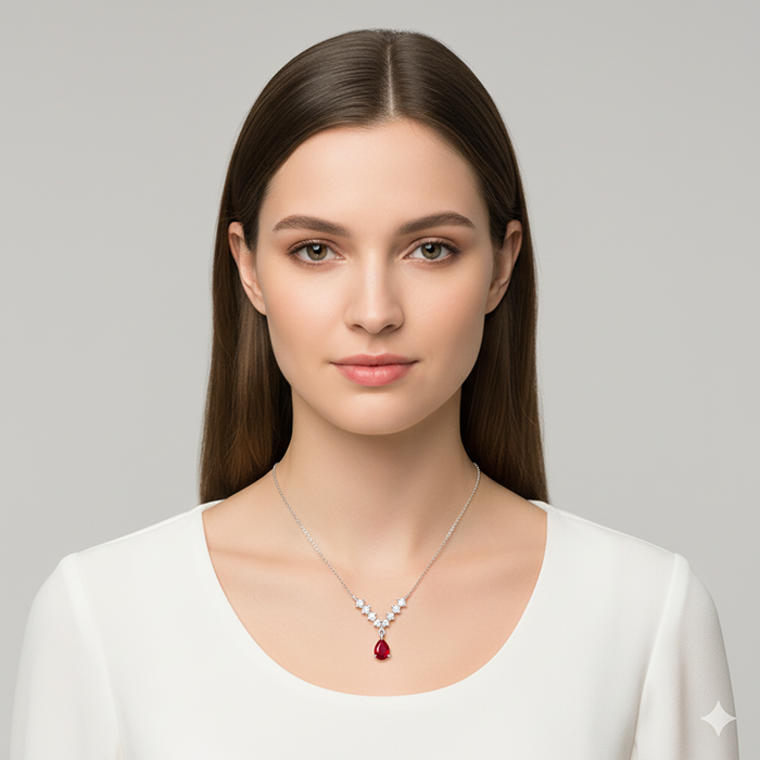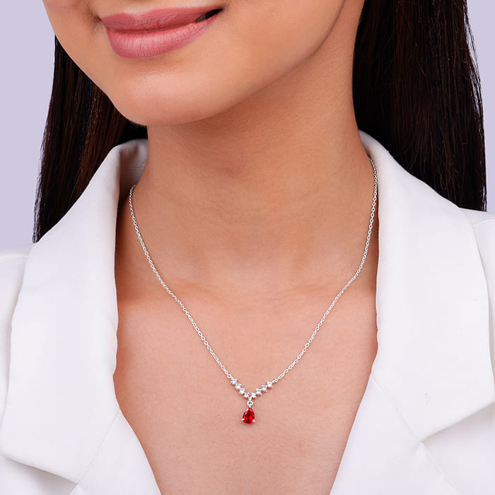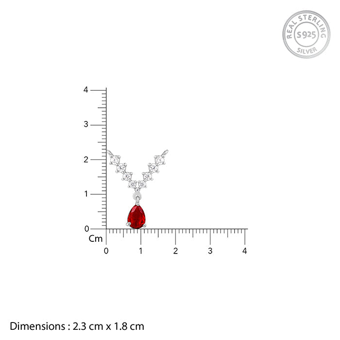 This silver necklace features a V type motif studded with zircons and a red-coloured peardrop hanging from the centre. Celebrate your moments of passion with GIVA’s Red Romance Collection.