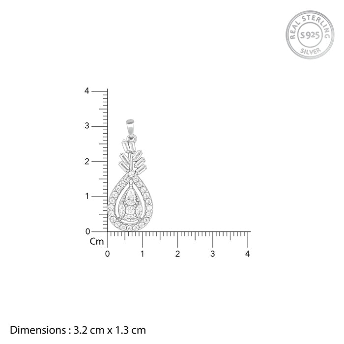 This silver pendant features a zircon studded pear drop motif with a zircon in the centre. The pear drop is attached to the line of branched zircons.