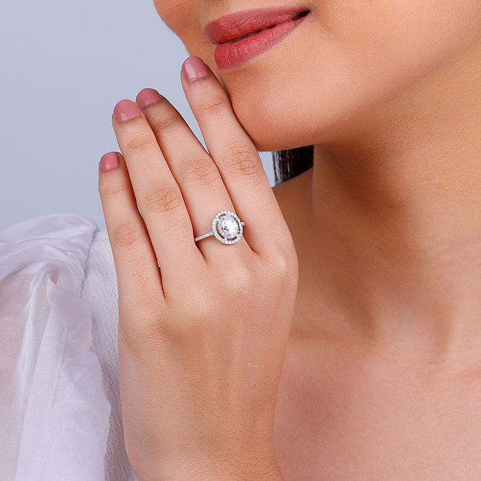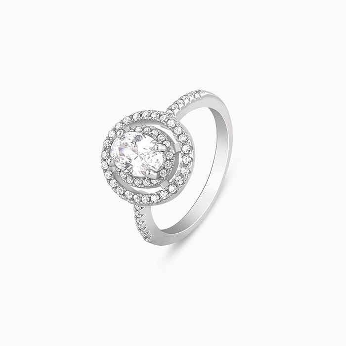This silver ring features an oval zircon nestled in a layer of zircons, embedded in an oval motif on a band set with zircons.