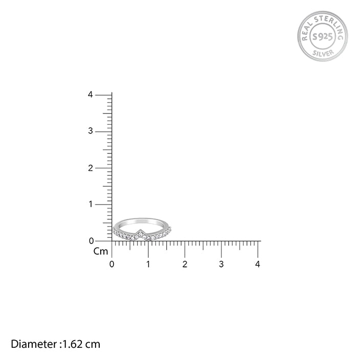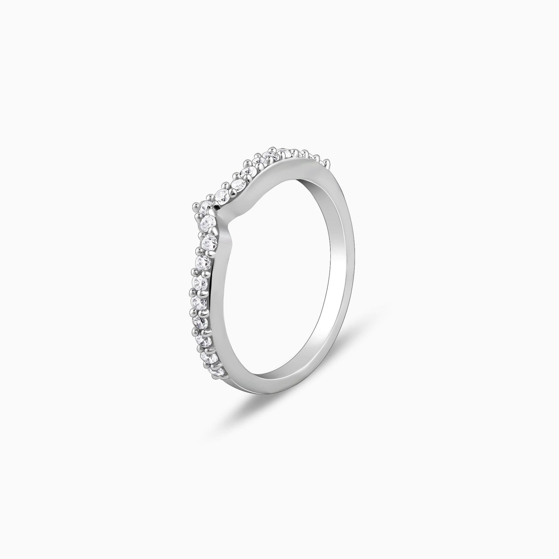 This silver ring has an arrowhead motif in the centre of a band, both studded with zircons.
