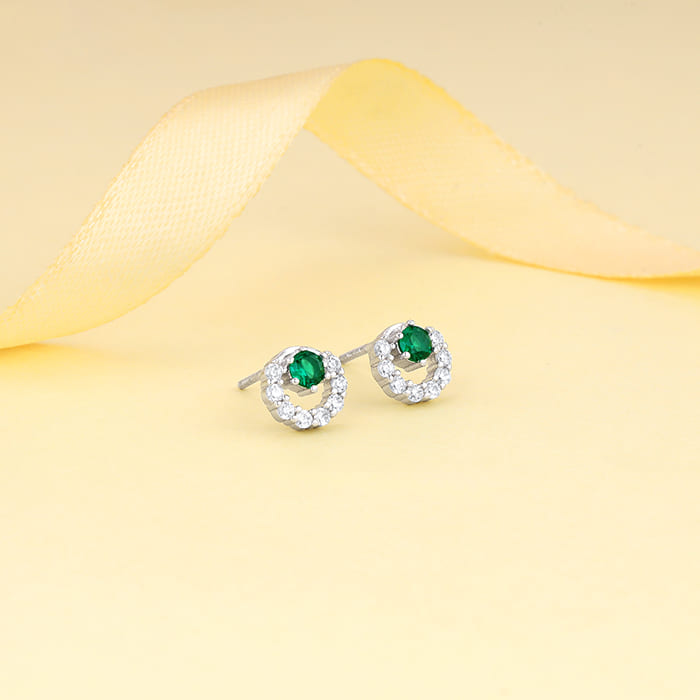Silver Emerald Green Halo Stud Earrings