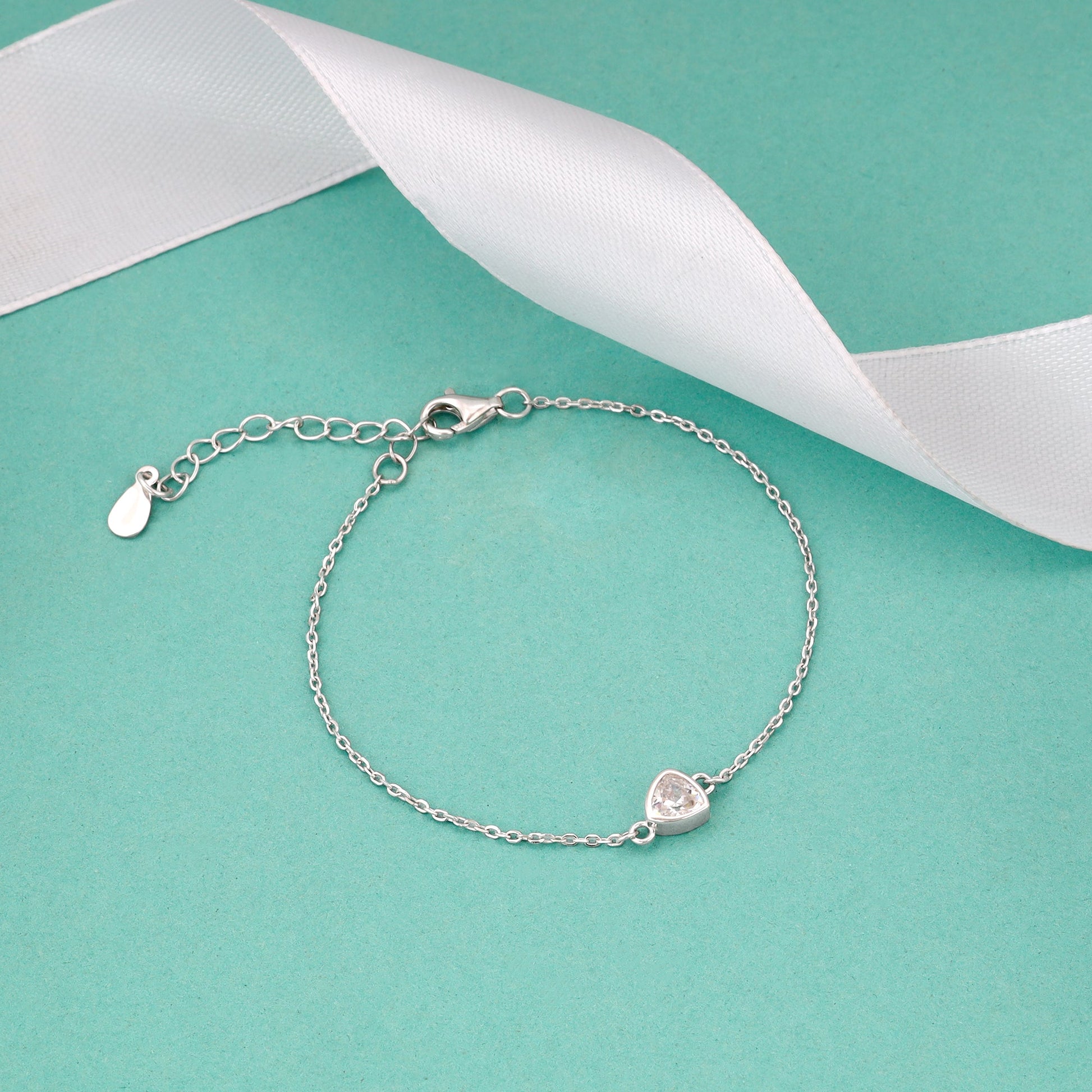 This silver bracelet has an adjustable chain with a soft triangle studded with zircons at the centre.