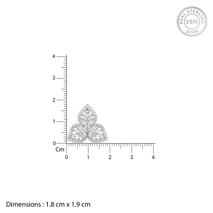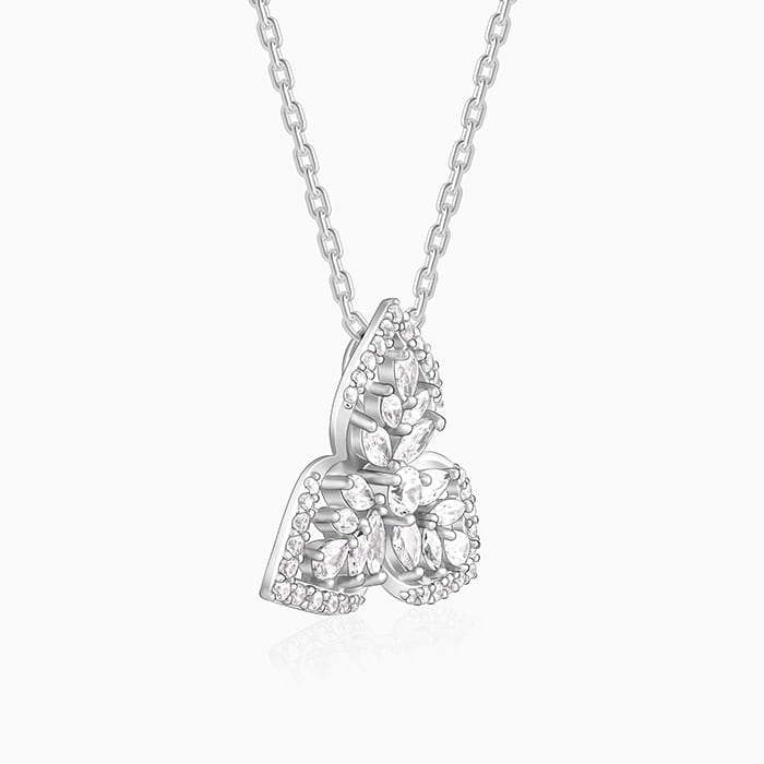 This silver pendant features a triple large leaf motif design adorned with zircons.