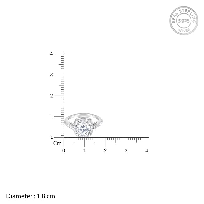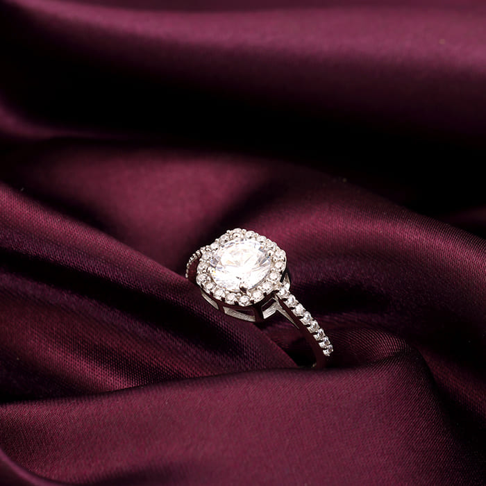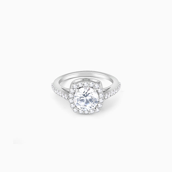 This silver ring has a square zircon set in the centre bordered with smaller ones. The band of the ring is also studded with zircons.
