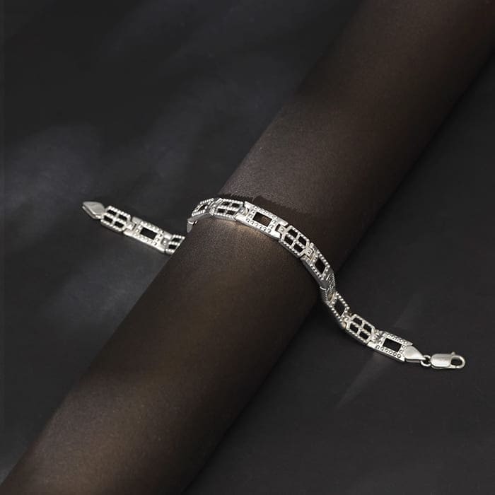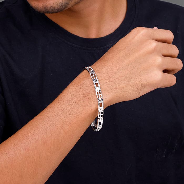 This men's silver bracelet features a geometric pattern design with an easy-to-wear clasp.