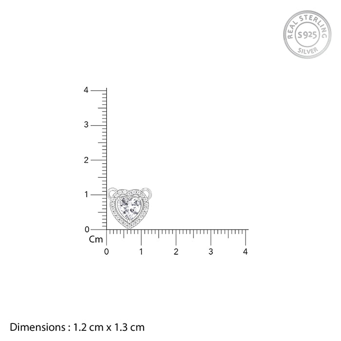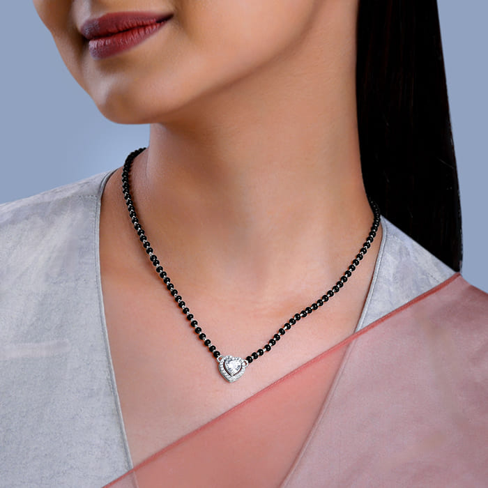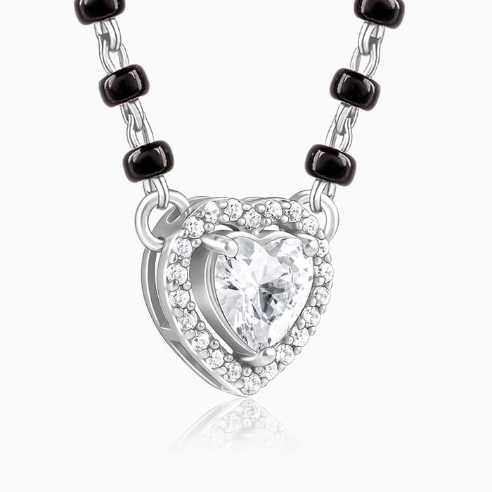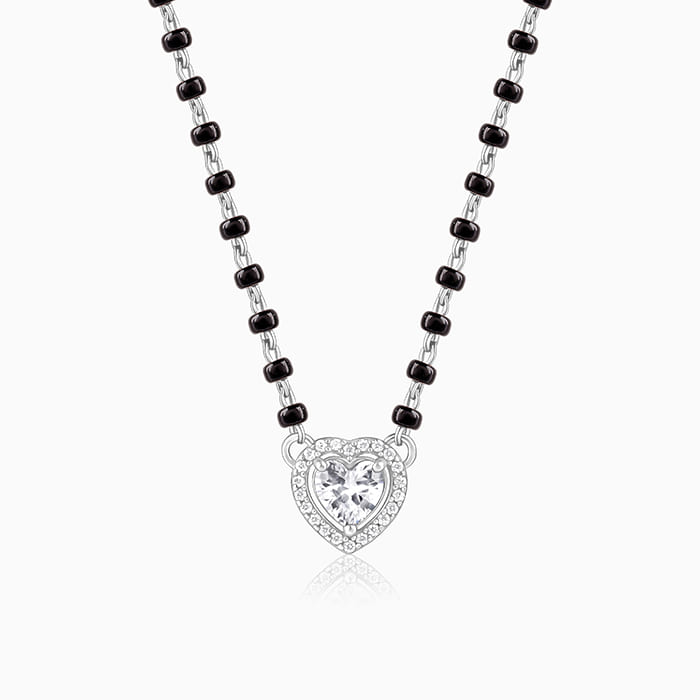 This silver mangalsutra features a heart motif studded with zircons and black beads.
