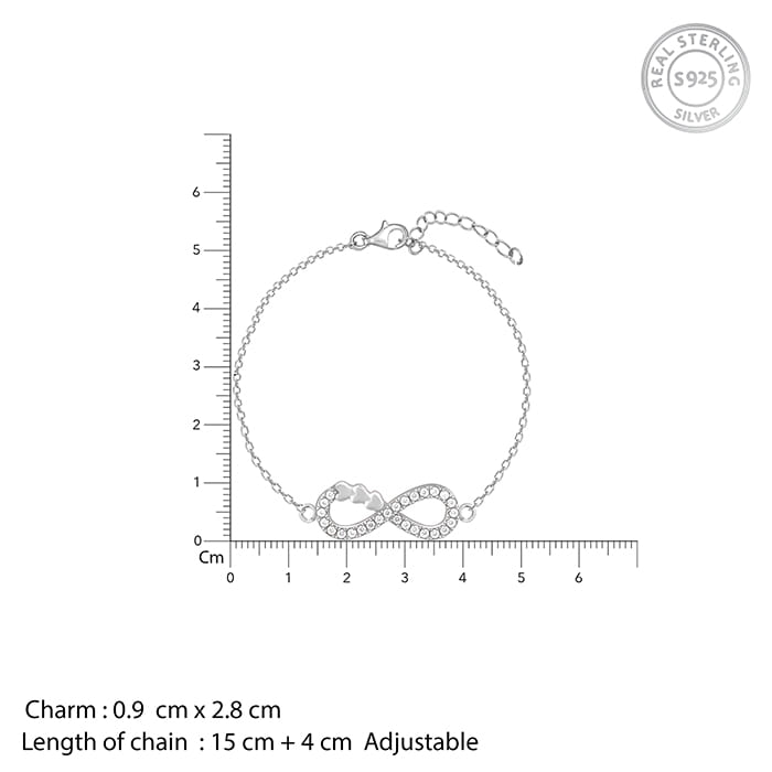 The silver bracelet has a very elegant design of an infinity shape - studded with zircons and 3 smaller hearts juxtaposed into the shape.
