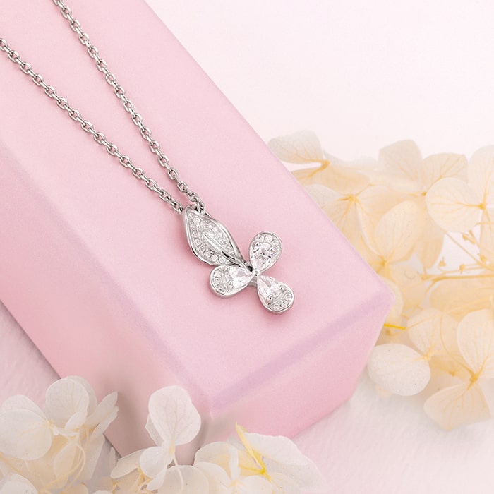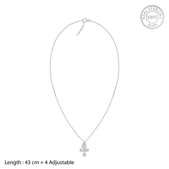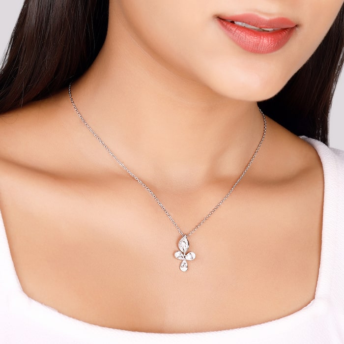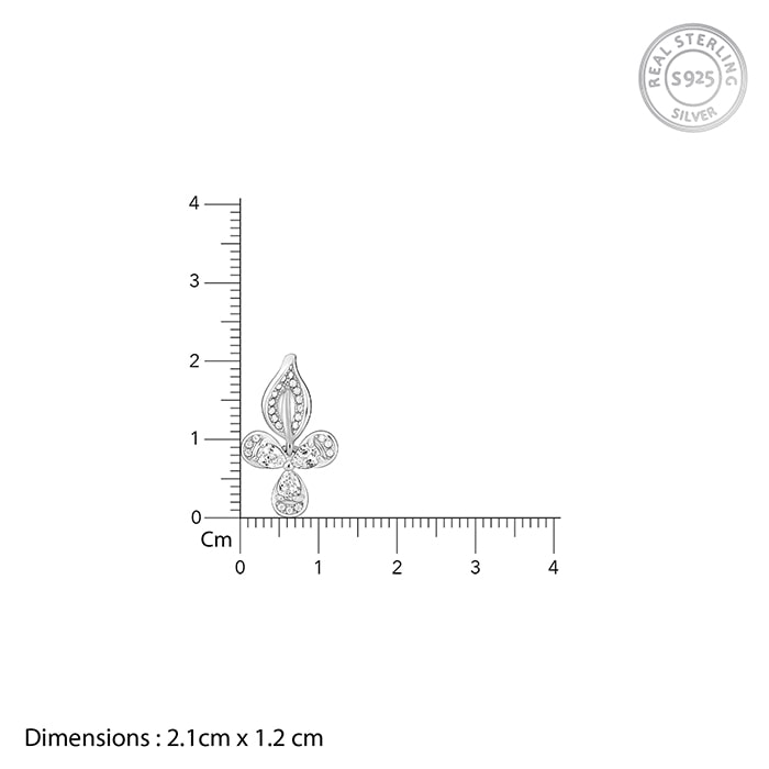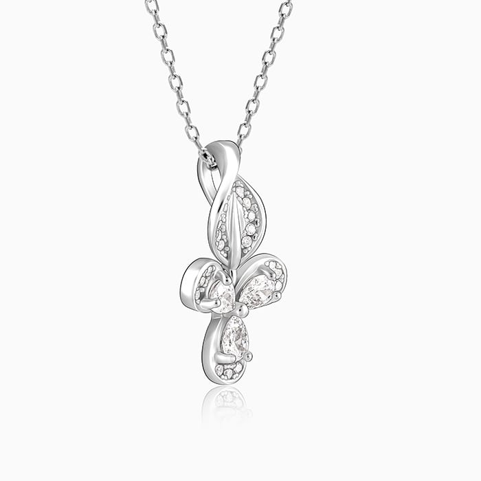 The silver pendant features a design with 3 petals with zircons studded on them.