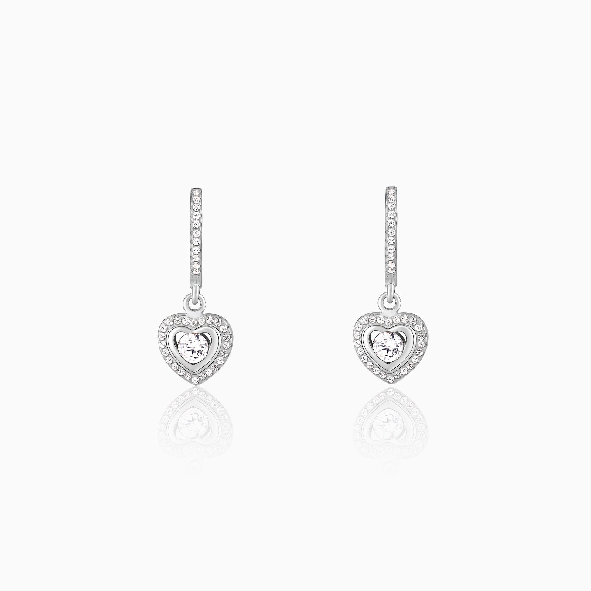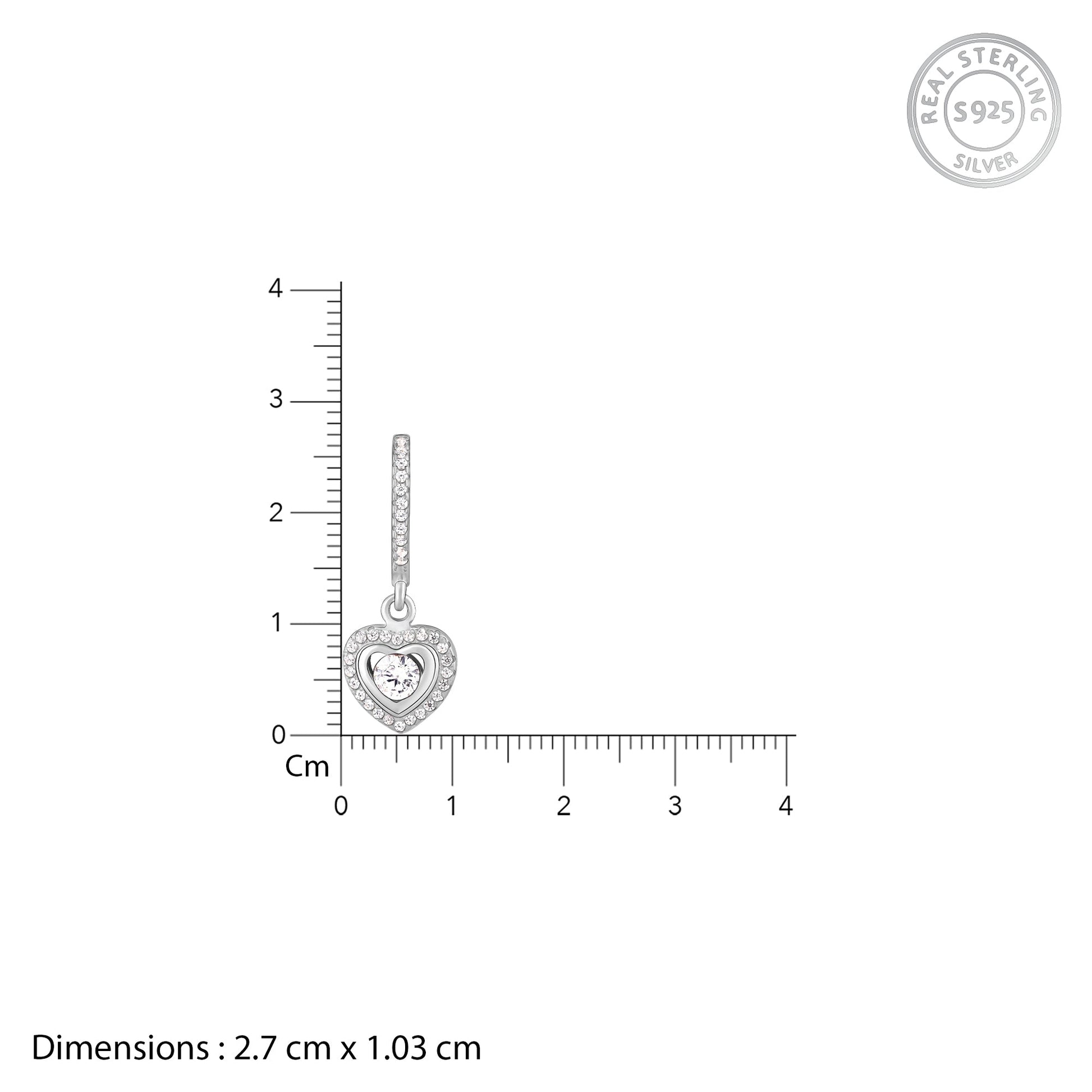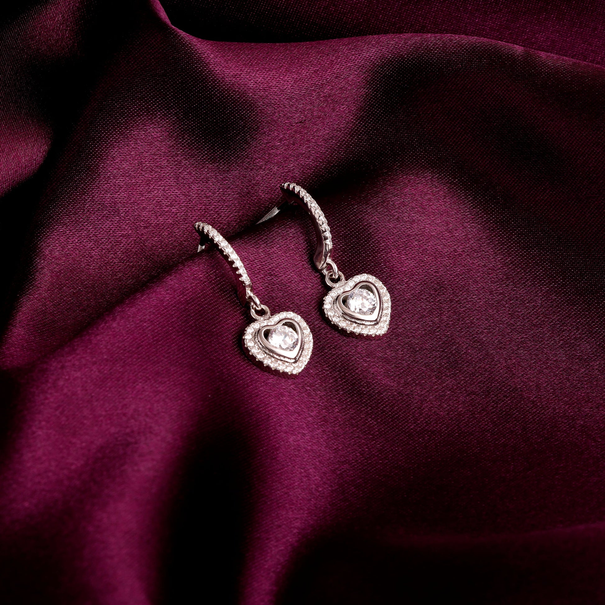 The silver earrings have a heart design with zircons studded on the rim and a round zircon studded at the centre.