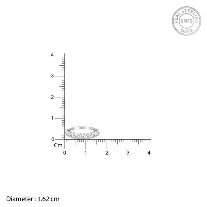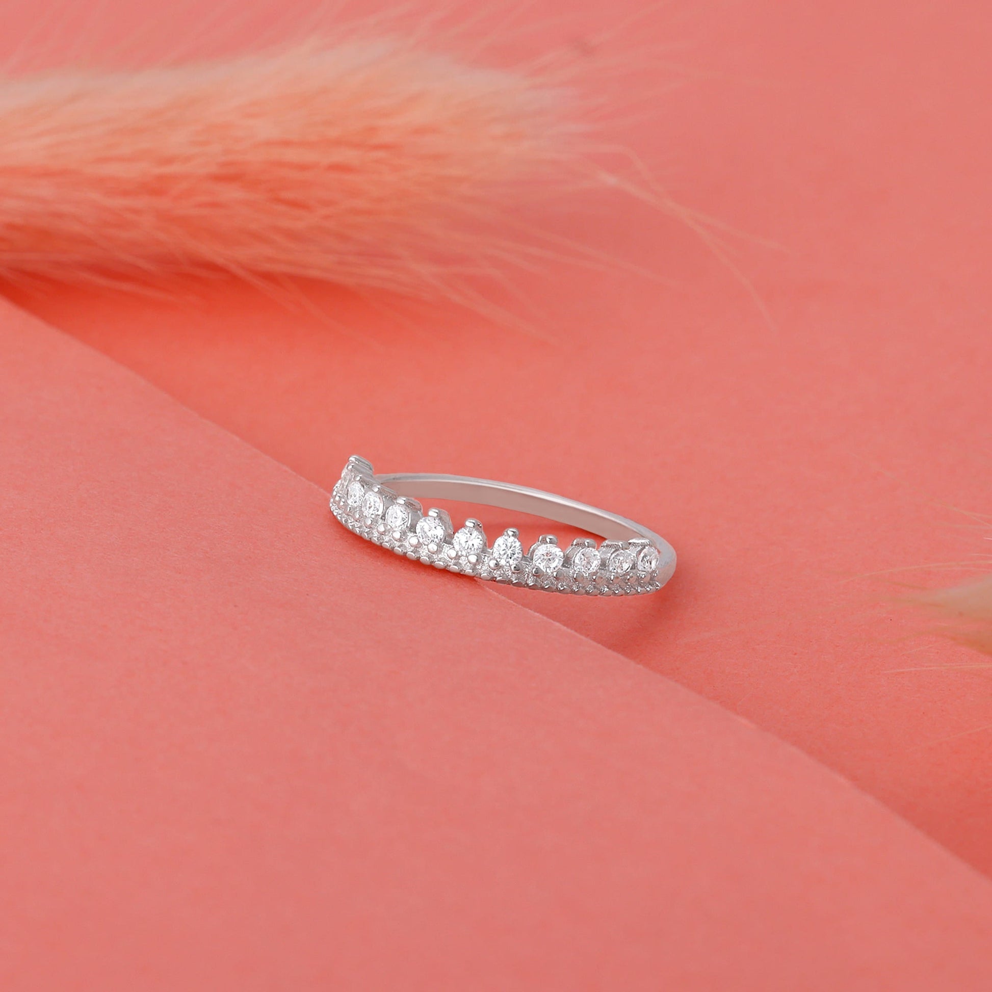This silver ring has a crown design studded with zircons extending to the front part of the band.