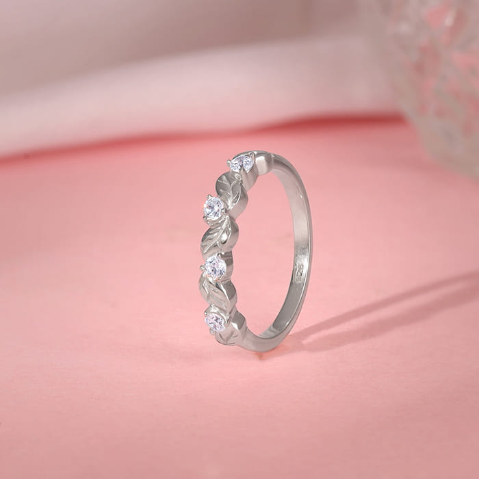 This silver ring for women features a leafy motif with zircons accentuating the design.