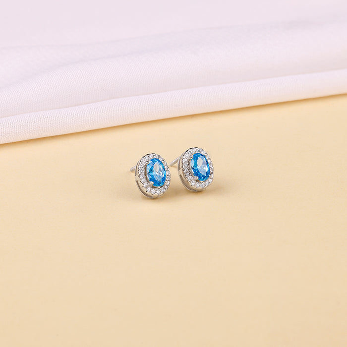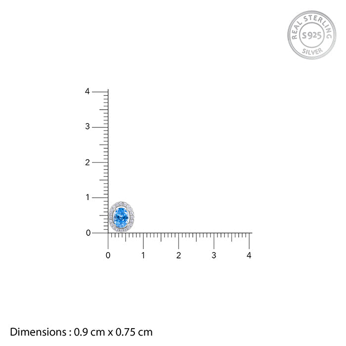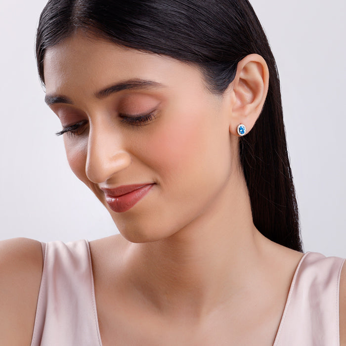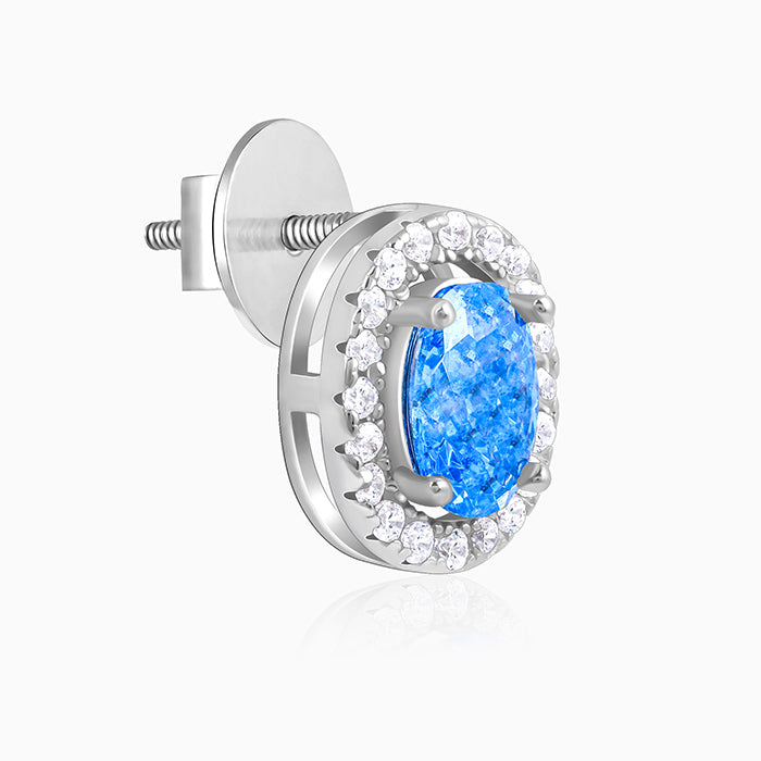 These silver studs for women feature a sleek circular design with a striking blue stone at the centre. The centre stone is surrounded by zircons, creating a halo design.