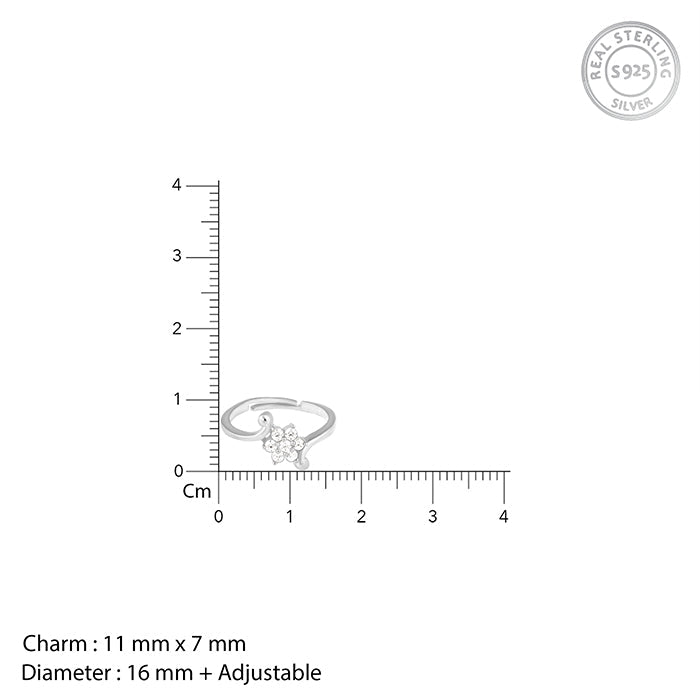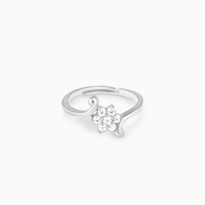 The Silver Snowflake Ring has a silver rim with converging ends held with a studded snowflake motif.