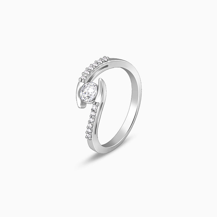 This silver ring features a circular zircon set in a bypass shank sporting zircons.
