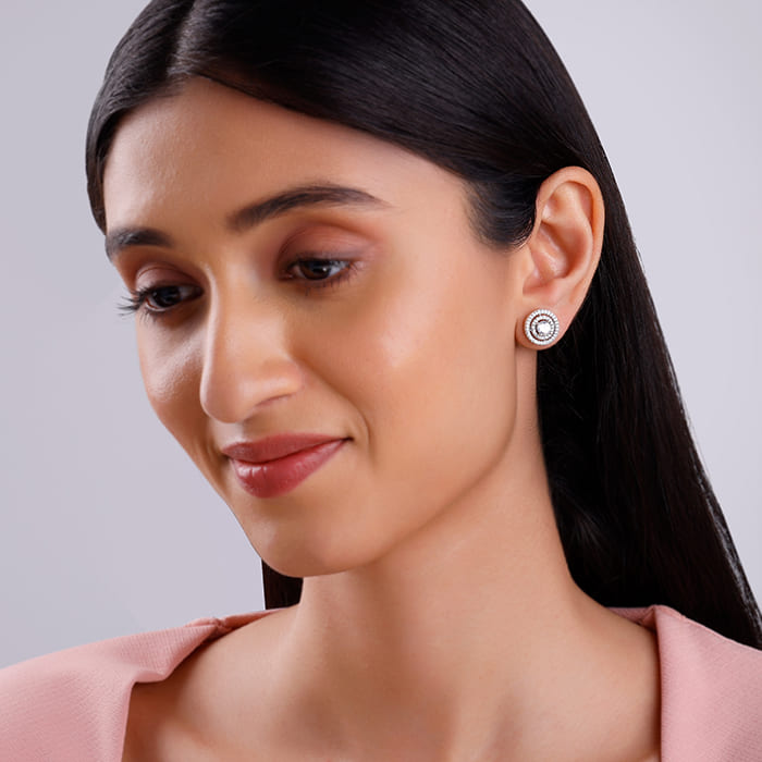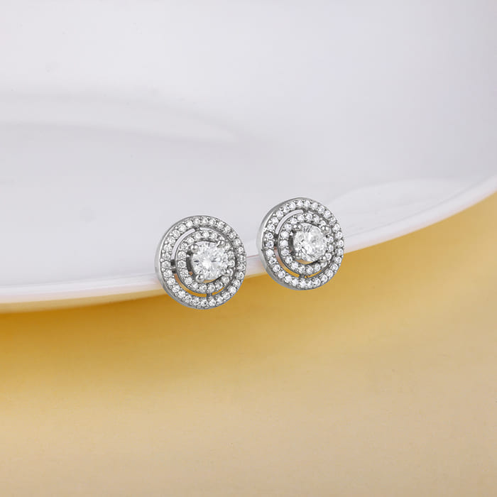 These silver studs for women feature a round, dual-halo design. The centre zircon is surrounded by two concentric circles of sparkling zircons.
